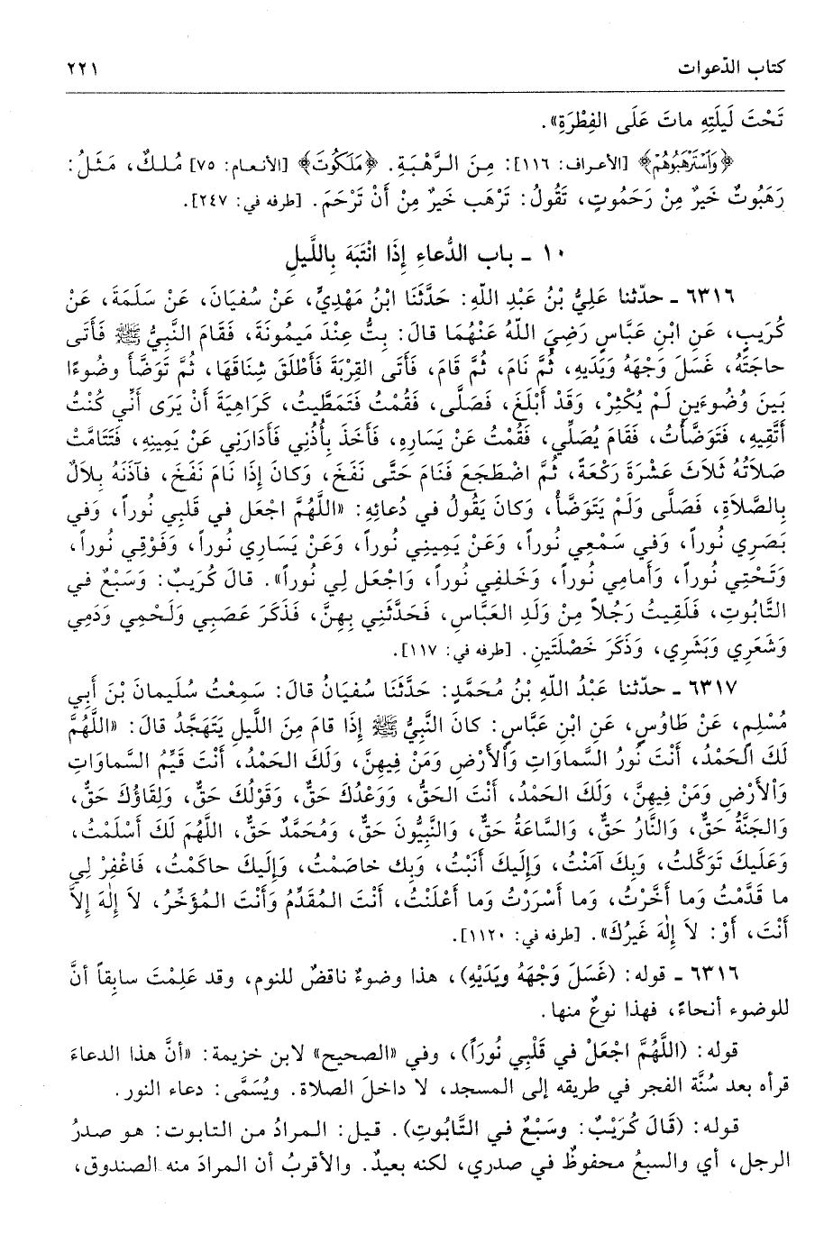 6316 - حَدَّثَنَا عَلِىُّ بْنُ عَبْدِ اللَّهِ حَدَّثَنَا ابْنُ مَهْدِىٍّ عَنْ سُفْيَانَ عَنْ سَلَمَةَ عَنْ كُرَيْبٍ عَنِ ابْنِ عَبَّاسٍ - رضى الله عنهما - قَالَ بِتُّ عِنْدَ مَيْمُونَةَ فَقَامَ النَّبِىُّ - صلى الله عليه وسلم - فَأَتَى حَاجَتَهُ، غَسَلَ وَجْهَهُ وَيَدَيْهِ، ثُمَّ نَامَ، ثُمَّ قَامَ فَأَتَى الْقِرْبَةَ فَأَطْلَقَ شِنَاقَهَا، ثُمَّ تَوَضَّأَ وُضُوءًا بَيْنَ وُضُوءَيْنِ لَمْ يُكْثِرْ، وَقَدْ أَبْلَغَ، فَصَلَّى، فَقُمْتُ فَتَمَطَّيْتُ كَرَاهِيَةَ أَنْ يَرَى أَنِّى كُنْتُ أَتَّقِيهِ، فَتَوَضَّأْتُ، فَقَامَ يُصَلِّى، فَقُمْتُ عَنْ يَسَارِهِ، فَأَخَذَ بِأُذُنِى فَأَدَارَنِى عَنْ يَمِينِهِ، فَتَتَامَّتْ صَلاَتُهُ ثَلاَثَ عَشْرَةَ رَكْعَةً ثُمَّ اضْطَجَعَ فَنَامَ حَتَّى نَفَخَ - وَكَانَ إِذَا نَامَ نَفَخَ - فَآذَنَهُ بِلاَلٌ بِالصَّلاَةِ، فَصَلَّى وَلَمْ يَتَوَضَّأْ، وَكَانَ يَقُولُ فِى دُعَائِهِ «اللَّهُمَّ اجْعَلْ فِى قَلْبِى نُورًا، وَفِى بَصَرِى نُورًا، وَفِى سَمْعِى نُورًا، وَعَنْ يَمِينِى نُورًا، وَعَنْ يَسَارِى نُورًا، وَفَوْقِى نُورًا، وَتَحْتِى نُورًا، وَأَمَامِى نُورًا، وَخَلْفِى نُورًا، وَاجْعَلْ لِى نُورًا». قَالَ كُرَيْبٌ وَسَبْعٌ فِى التَّابُوتِ. فَلَقِيتُ رَجُلاً مِنْ وَلَدِ الْعَبَّاسِ فَحَدَّثَنِى بِهِنَّ، فَذَكَرَ عَصَبِى وَلَحْمِى وَدَمِى وَشَعَرِى وَبَشَرِى، وَذَكَرَ خَصْلَتَيْنِ. أطرافه 117، 138، 183، 697، 698، 699، 726، 728، 859، 1198، 4569، 4570، 4571، 4572، 5919، 6215، 7452 - تحفة 6352