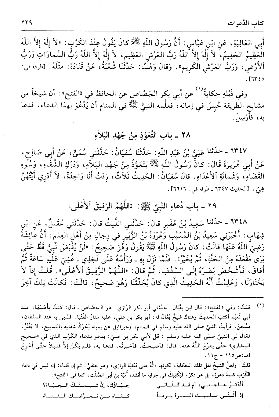 (¬1) قلتُ: وفي "الفتح": قال ابن بطال: حدَّثني أبو بكر الرازي -هو الجصَّاص- قال: كنتُ بآصْبَهَان عند أبي نُعَيْم أكتبَ الحديثَ وهناك شيخٌ يُقَالُ له: أبو بكر بن علي، عليه مدارُ الفُتْيَا. فَسُعِي به عند السلطان، فسُجِنَ. فرأيتُ النبيَّ صلى الله عليه وسلم في المنام، وجبرائيل عن يمينه يُحَرِّكُ شفتيه بالتسبيح، لا يَفْتُرُ. فقال لي النبي صلى الله عليه وسلم: قل لأبي بكر بن عليّ: يدعو بدعاء الكَرْب الذي في "صحيح البخاري" حتى يفرِّجَ اللهُ عنه. قال: فأصبحتُ، فأخبرتُه، فدعا به، فلم يَكُنْ إلَّا قليلًا حتَّى أُخْرِجَ اهـ: ص 115 - ج 11.