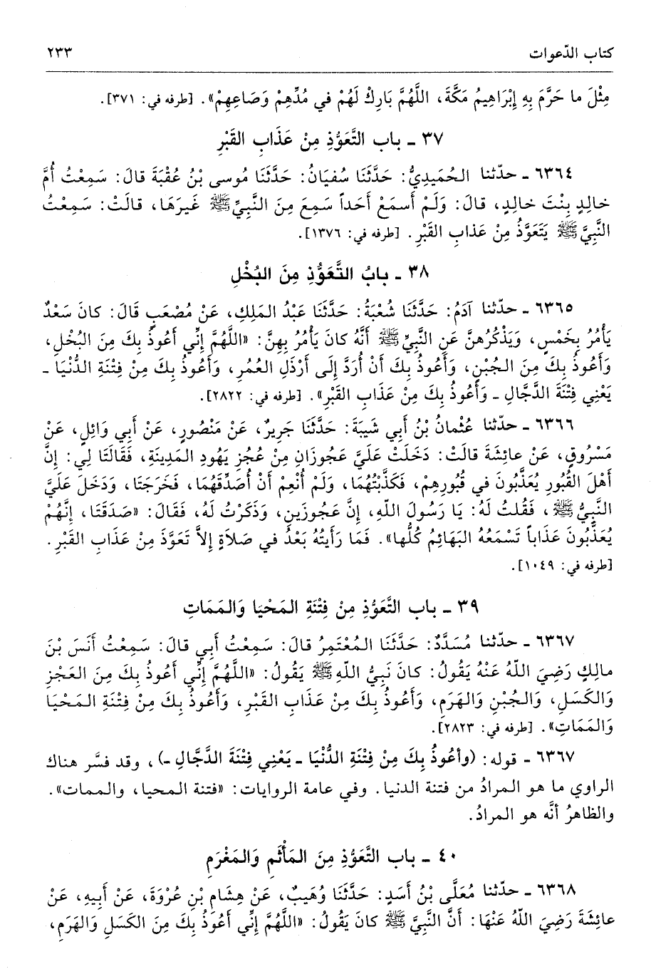 6365 - حَدَّثَنَا آدَمُ حَدَّثَنَا شُعْبَةُ حَدَّثَنَا عَبْدُ الْمَلِكِ عَنْ مُصْعَبٍ كَانَ سَعْدٌ يَأْمُرُ بِخَمْسٍ وَيَذْكُرُهُنَّ عَنِ النَّبِىِّ - صلى الله عليه وسلم - أَنَّهُ كَانَ يَأْمُرُ بِهِنَّ «اللَّهُمَّ إِنِّى أَعُوذُ بِكَ مِنَ الْبُخْلِ، وَأَعُوذُ بِكَ مِنَ الْجُبْنِ، وَأَعُوذُ بِكَ أَنْ أُرَدَّ إِلَى أَرْذَلِ الْعُمُرِ، وَأَعُوذُ بِكَ مِنْ فِتْنَةِ الدُّنْيَا يَعْنِى فِتْنَةَ الدَّجَّالِ وَأَعُوذُ بِكَ مِنْ عَذَابِ الْقَبْرِ». أطرافه 2822، 6370، 6374، 6390 - تحفة 3932
