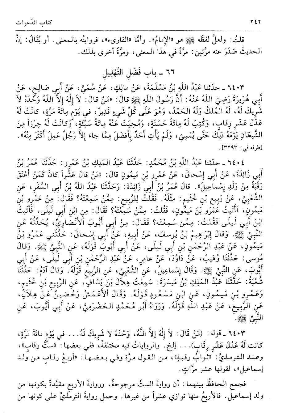 6404 - حَدَّثَنَا عَبْدُ اللَّهِ بْنُ مُحَمَّدٍ حَدَّثَنَا عَبْدُ الْمَلِكِ بْنُ عَمْرٍو حَدَّثَنَا عُمَرُ بْنُ أَبِى زَائِدَةَ عَنْ أَبِى إِسْحَاقَ عَنْ عَمْرِو بْنِ مَيْمُونٍ قَالَ مَنْ قَالَ عَشْرًا كَانَ كَمَنْ أَعْتَقَ رَقَبَةً مِنْ وَلَدِ إِسْمَاعِيلَ. قَالَ عُمَرُ بْنُ أَبِى زَائِدَةَ وَحَدَّثَنَا عَبْدُ اللَّهِ بْنُ أَبِى السَّفَرِ عَنِ الشَّعْبِىِّ عَنْ رَبِيعِ بْنِ خُثَيْمٍ مِثْلَهُ. فَقُلْتُ لِلرَّبِيعِ مِمَّنْ سَمِعْتَهُ فَقَالَ مِنْ عَمْرِو بْنِ مَيْمُونٍ. فَأَتَيْتُ عَمْرَو بْنَ مَيْمُونٍ فَقُلْتُ مِمَّنْ سَمِعْتَهُ فَقَالَ مِنِ ابْنِ أَبِى لَيْلَى. فَأَتَيْتُ ابْنَ أَبِى لَيْلَى فَقُلْتُ مِمَّنْ سَمِعْتَهُ فَقَالَ مِنْ أَبِى أَيُّوبَ الأَنْصَارِىِّ يُحَدِّثُهُ عَنِ النَّبِىِّ - صلى الله عليه وسلم - وَقَالَ إِبْرَاهِيمُ بْنُ يُوسُفَ عَنْ أَبِيهِ عَنْ أَبِى إِسْحَاقَ حَدَّثَنِى عَمْرُو بْنُ مَيْمُونٍ عَنْ عَبْدِ الرَّحْمَنِ بْنِ أَبِى لَيْلَى عَنْ أَبِى أَيُّوبَ قَوْلَهُ عَنِ النَّبِىِّ - صلى الله عليه وسلم -. وَقَالَ مُوسَى حَدَّثَنَا وُهَيْبٌ عَنْ دَاوُدَ عَنْ عَامِرٍ عَنْ عَبْدِ الرَّحْمَنِ بْنِ أَبِى لَيْلَى عَنْ أَبِى أَيُّوبَ عَنِ النَّبِىِّ - صلى الله عليه وسلم -. وَقَالَ إِسْمَاعِيلُ عَنِ الشَّعْبِىِّ عَنِ الرَّبِيعِ قَوْلَهُ. وَقَالَ آدَمُ حَدَّثَنَا شُعْبَةُ حَدَّثَنَا عَبْدُ الْمَلِكِ بْنُ مَيْسَرَةَ سَمِعْتُ هِلاَلَ بْنَ يَسَافٍ عَنِ الرَّبِيعِ بْنِ خُثَيْمٍ وَعَمْرِو بْنِ مَيْمُونٍ عَنِ ابْنِ مَسْعُودٍ قَوْلَهُ. وَقَالَ الأَعْمَشُ وَحُصَيْنٌ عَنْ هِلاَلٍ عَنِ الرَّبِيعِ عَنْ عَبْدِ اللَّهِ قَوْلَهُ. وَرَوَاهُ أَبُو مُحَمَّدٍ الْحَضْرَمِىُّ عَنْ أَبِى أَيُّوبَ عَنِ النَّبِىِّ - صلى الله عليه وسلم -. تحفة 3471 - 107/ 8
