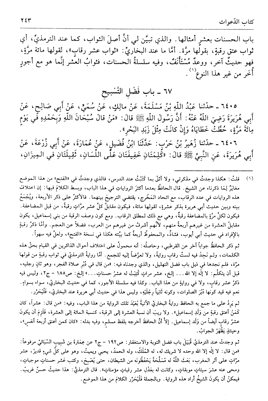 ثم ذكر الحافظُ جوابًا آخر عن القرطبي، وحاصلُه: أنه محمولٌ على اختلاف أحوال الذاكرين في القيام بحقِّ هذه الكلمات، ولم نَجِدْ فيه لستِّ رقابٍ روايةً، ولا تعرُّضًا إليه للجمع. أمَّا روايةُ الترمذيِّ في ثواب رقبةٍ من قولها مرَّة، فلم نجدها في ذيل باب فضل التهليل، والذي وجدناه فيه: "من قال في دُبُرِ صلاة الفجر، وهو ثان رجليه، قبل أن يتكلَّم: لا إله إلا الله ... إلخ، عشر مراتٍ كُتِبَتْ له عشرُ حسناتِ ... " إلخ: ص 185 - ج 2، وليس فيه ذكرُ عشر رقاب، ولا في روايه من هذا الباب. وكذا فيه سلسلة الأجور، كما في حديث البخاريِّ، سواء بسواءٍ. نعم فيه قيد كونها دُبُرَ الصلوات، وكونه ثَانِيًا رِجْلَيْهِ، وليس هذا في حديث أبي هريرة عند البخاريِّ، فَليُحَرَّر.
