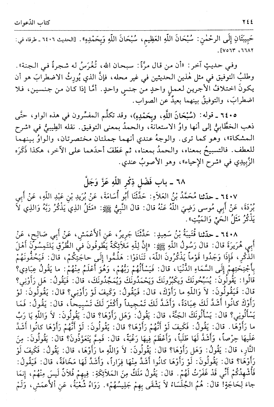 حَبِيبَتَانِ إِلَى الرَّحْمَنِ، سُبْحَانَ اللَّهِ الْعَظِيمِ، سُبْحَانَ اللَّهِ وَبِحَمْدِهِ». طرفاه 6682، 7563 - تحفة 14899