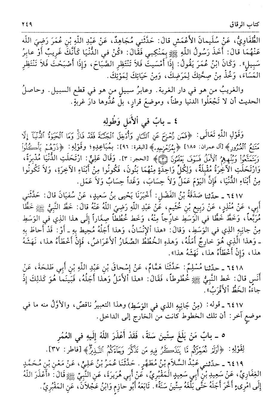 6417 - حَدَّثَنَا صَدَقَةُ بْنُ الْفَضْلِ أَخْبَرَنَا يَحْيَى عَنْ سُفْيَانَ قَالَ حَدَّثَنِى أَبِى عَنْ مُنْذِرٍ عَنْ رَبِيعِ بْنِ خُثَيْمٍ عَنْ عَبْدِ اللَّهِ - رضى الله عنه - قَالَ خَطَّ النَّبِىُّ - صلى الله عليه وسلم - خَطًّا مُرَبَّعًا، وَخَطَّ خَطًّا فِى الْوَسَطِ خَارِجًا مِنْهُ، وَخَطَّ خُطُطًا صِغَارًا إِلَى هَذَا الَّذِى فِى الْوَسَطِ، مِنْ جَانِبِهِ الَّذِى فِى الْوَسَطِ وَقَالَ «هَذَا الإِنْسَانُ، وَهَذَا أَجَلُهُ مُحِيطٌ بِهِ - أَوْ قَدْ أَحَاطَ بِهِ - وَهَذَا الَّذِى هُوَ خَارِجٌ أَمَلُهُ، وَهَذِهِ الْخُطُطُ الصِّغَارُ الأَعْرَاضُ، فَإِنْ أَخْطَأَهُ هَذَا نَهَشَهُ هَذَا، وَإِنْ أَخْطَأَهُ هَذَا نَهَشَهُ هَذَا». تحفة 9200 - 111/ 8