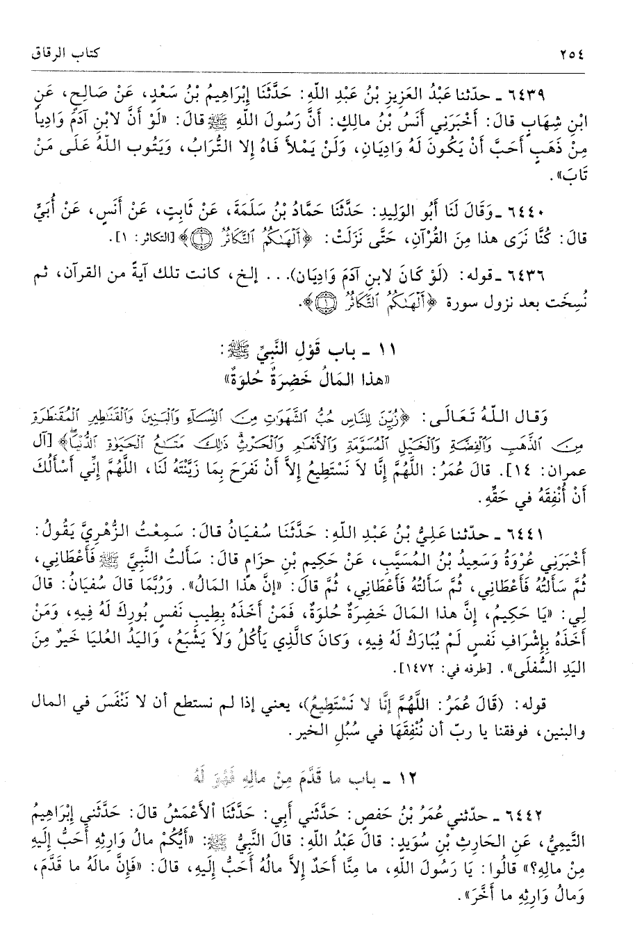 6436 - قوله: (لَوْ كَانَ لابنِ آدَمَ وَادِيَان) ... إلخ، كانت تلك آيةً من القرآن، ثم نُسِخَت بعد نزول سورة {أَلْهَاكُمُ التَّكَاثُرُ (1)}.
