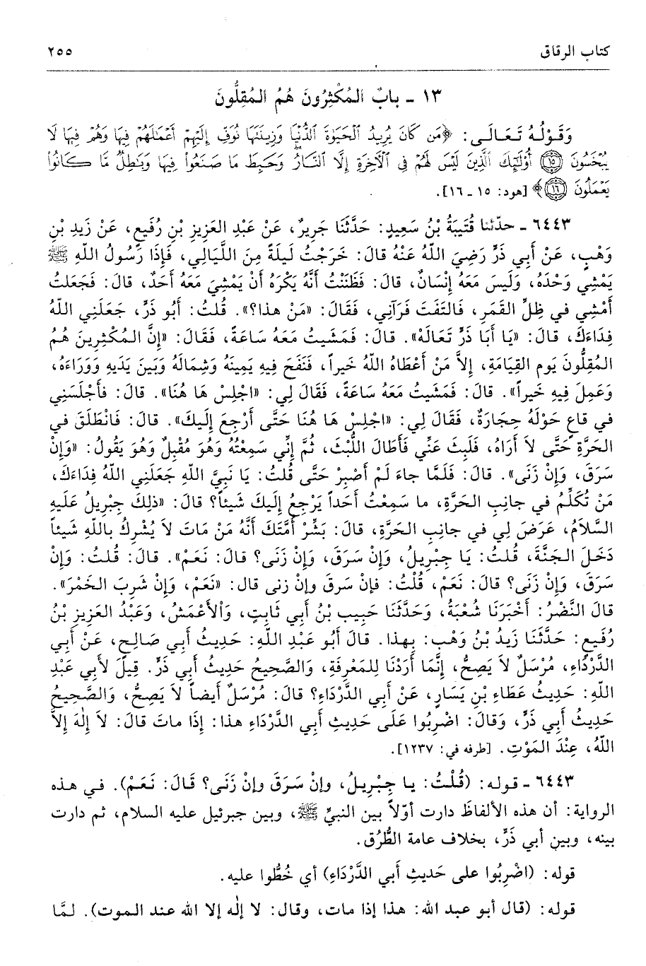 6443 - حَدَّثَنَا قُتَيْبَةُ بْنُ سَعِيدٍ حَدَّثَنَا جَرِيرٌ عَنْ عَبْدِ الْعَزِيزِ بْنِ رُفَيْعٍ عَنْ زَيْدِ بْنِ وَهْبٍ عَنْ أَبِى ذَرٍّ - رضى الله عنه - قَالَ خَرَجْتُ لَيْلَةً مِنَ اللَّيَالِى فَإِذَا رَسُولُ اللَّهِ - صلى الله عليه وسلم - يَمْشِى وَحْدَهُ، وَلَيْسَ مَعَهُ إِنْسَانٌ - قَالَ - فَظَنَنْتُ أَنَّهُ يَكْرَهُ أَنْ يَمْشِىَ مَعَهُ أَحَدٌ - قَالَ - فَجَعَلْتُ أَمْشِى فِى ظِلِّ الْقَمَرِ فَالْتَفَتَ فَرَآنِى فَقَالَ «مَنْ هَذَا». قُلْتُ أَبُو ذَرٍّ جَعَلَنِى اللَّهُ فِدَاءَكَ. قَالَ «يَا أَبَا ذَرٍّ تَعَالَهْ». قَالَ فَمَشَيْتُ مَعَهُ سَاعَةً فَقَالَ «إِنَّ الْمُكْثِرِينَ هُمُ الْمُقِلُّونَ يَوْمَ الْقِيَامَةِ، إِلاَّ مَنْ أَعْطَاهُ اللَّهُ خَيْرًا، فَنَفَحَ فِيهِ يَمِينَهُ وَشِمَالَهُ وَبَيْنَ يَدَيْهِ وَوَرَاءَهُ، وَعَمِلَ فِيهِ خَيْرًا». قَالَ فَمَشَيْتُ مَعَهُ سَاعَةً فَقَالَ لِى «اجْلِسْ هَا هُنَا». قَالَ فَأَجْلَسَنِى فِى قَاعٍ حَوْلَهُ حِجَارَةٌ فَقَالَ لِى «اجْلِسْ هَا هُنَا حَتَّى أَرْجِعَ إِلَيْكَ». قَالَ فَانْطَلَقَ فِى الْحَرَّةِ حَتَّى لاَ أَرَاهُ فَلَبِثَ عَنِّى فَأَطَالَ اللُّبْثَ، ثُمَّ إِنِّى سَمِعْتُهُ وَهْوَ مُقْبِلٌ وَهْوَ يَقُولُ «وَإِنْ سَرَقَ وَإِنْ زَنَى». قَالَ فَلَمَّا جَاءَ لَمْ أَصْبِرْ حَتَّى قُلْتُ يَا نَبِىَّ اللَّهِ جَعَلَنِى اللَّهُ فِدَاءَكَ مَنْ تُكَلِّمُ فِى جَانِبِ الْحَرَّةِ مَا سَمِعْتُ أَحَدًا يَرْجِعُ إِلَيْكَ شَيْئًا. قَالَ «ذَلِكَ جِبْرِيلُ - عَلَيْهِ السَّلاَمُ - عَرَضَ لِى فِى جَانِبِ الْحَرَّةِ، قَالَ بَشِّرْ أُمَّتَكَ أَنَّهُ مَنْ مَاتَ لاَ يُشْرِكُ بِاللَّهِ شَيْئًا دَخَلَ الْجَنَّةَ، قُلْتُ يَا جِبْرِيلُ وَإِنْ سَرَقَ وَإِنْ زَنَى قَالَ نَعَمْ. قَالَ قُلْتُ وَإِنْ سَرَقَ وَإِنْ زَنَى قَالَ نَعَمْ، وَإِنْ شَرِبَ الْخَمْرَ». قَالَ النَّضْرُ أَخْبَرَنَا شُعْبَةُ وَحَدَّثَنَا حَبِيبُ بْنُ أَبِى ثَابِتٍ وَالأَعْمَشُ وَعَبْدُ الْعَزِيزِ بْنُ رُفَيْعٍ حَدَّثَنَا زَيْدُ بْنُ وَهْبٍ بِهَذَا. قَالَ أَبُو عَبْدِ اللَّهِ حَدِيثُ أَبِى صَالِحٍ عَنْ أَبِى الدَّرْدَاءِ مُرْسَلٌ، لاَ يَصِحُّ، إِنَّمَا أَرَدْنَا لِلْمَعْرِفَةِ، وَالصَّحِيحُ حَدِيثُ أَبِى ذَرٍّ. قِيلَ لأَبِى عَبْدِ اللَّهِ حَدِيثُ عَطَاءِ بْنِ يَسَارٍ عَنْ أَبِى الدَّرْدَاءِ قَالَ مُرْسَلٌ أَيْضًا لاَ يَصِحُّ، وَالصَّحِيحُ حَدِيثُ أَبِى ذَرٍّ. وَقَالَ اضْرِبُوا عَلَى حَدِيثِ أَبِى الدَّرْدَاءِ هَذَا. إِذَا مَاتَ قَالَ لاَ إِلَهَ إِلاَّ اللَّهُ. عِنْدَ الْمَوْتِ. أطرافه 1237، 1408، 2388، 3222، 5827، 6268، 6444، 7487 تحفة 11915 - 117/ 8