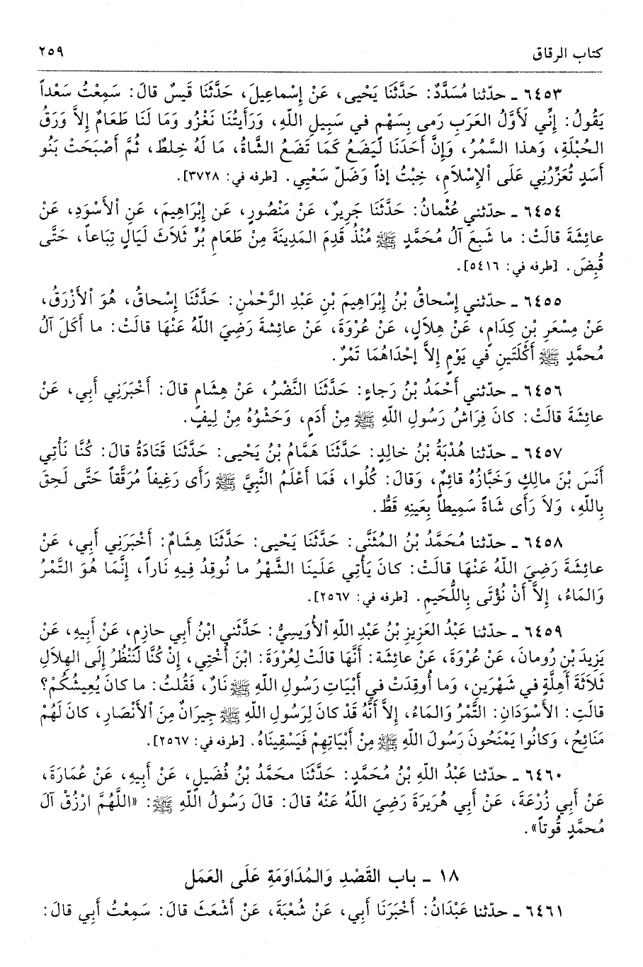 6460 - حَدَّثَنَا عَبْدُ اللَّهِ بْنُ مُحَمَّدٍ حَدَّثَنَا مُحَمَّدُ بْنُ فُضَيْلٍ عَنْ أَبِيهِ عَنْ عُمَارَةَ عَنْ أَبِى زُرْعَةَ عَنْ أَبِى هُرَيْرَةَ - رضى الله عنه - قَالَ قَالَ رَسُولُ اللَّهِ - صلى الله عليه وسلم - «اللَّهُمَّ ارْزُقْ آلَ مُحَمَّدٍ قُوتًا». تحفة 14898