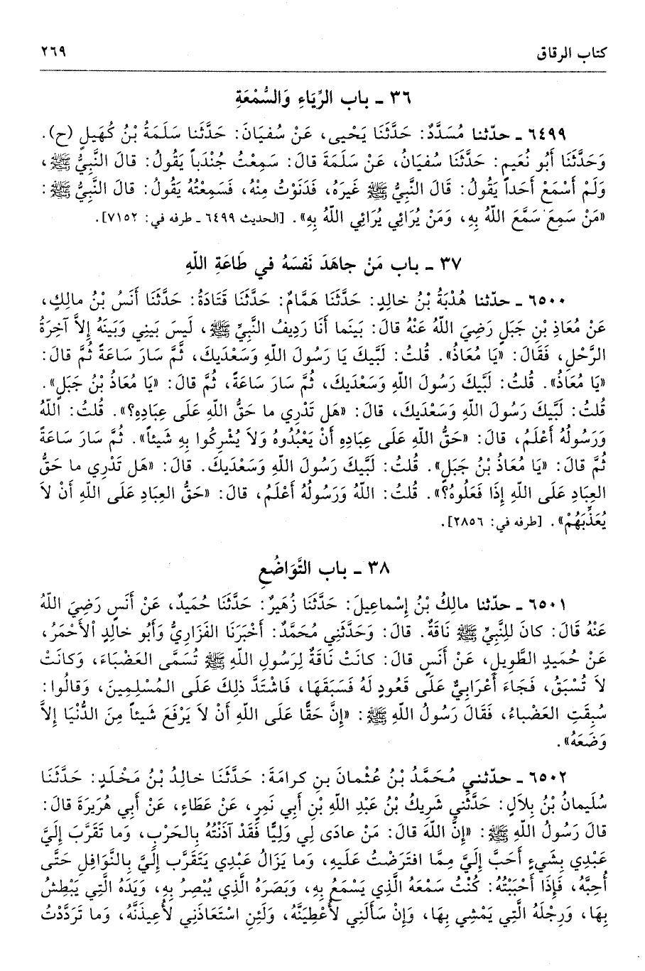 6499 - حَدَّثَنَا مُسَدَّدٌ حَدَّثَنَا يَحْيَى عَنْ سُفْيَانَ حَدَّثَنِى سَلَمَةُ بْنُ كُهَيْلٍ. وَحَدَّثَنَا أَبُو نُعَيْمٍ حَدَّثَنَا سُفْيَانُ عَنْ سَلَمَةَ قَالَ سَمِعْتُ جُنْدَبًا يَقُولُ قَالَ النَّبِىُّ - صلى الله عليه وسلم - وَلَمْ أَسْمَعْ أَحَدًا يَقُولُ قَالَ النَّبِىُّ - صلى الله عليه وسلم - غَيْرَهُ فَدَنَوْتُ مِنْهُ فَسَمِعْتُهُ يَقُولُ قَالَ النَّبِىُّ - صلى الله عليه وسلم - «مَنْ سَمَّعَ سَمَّعَ اللَّهُ بِهِ، وَمَنْ يُرَائِى يُرَائِى اللَّهُ بِهِ». طرفه 7152 - تحفة 3257