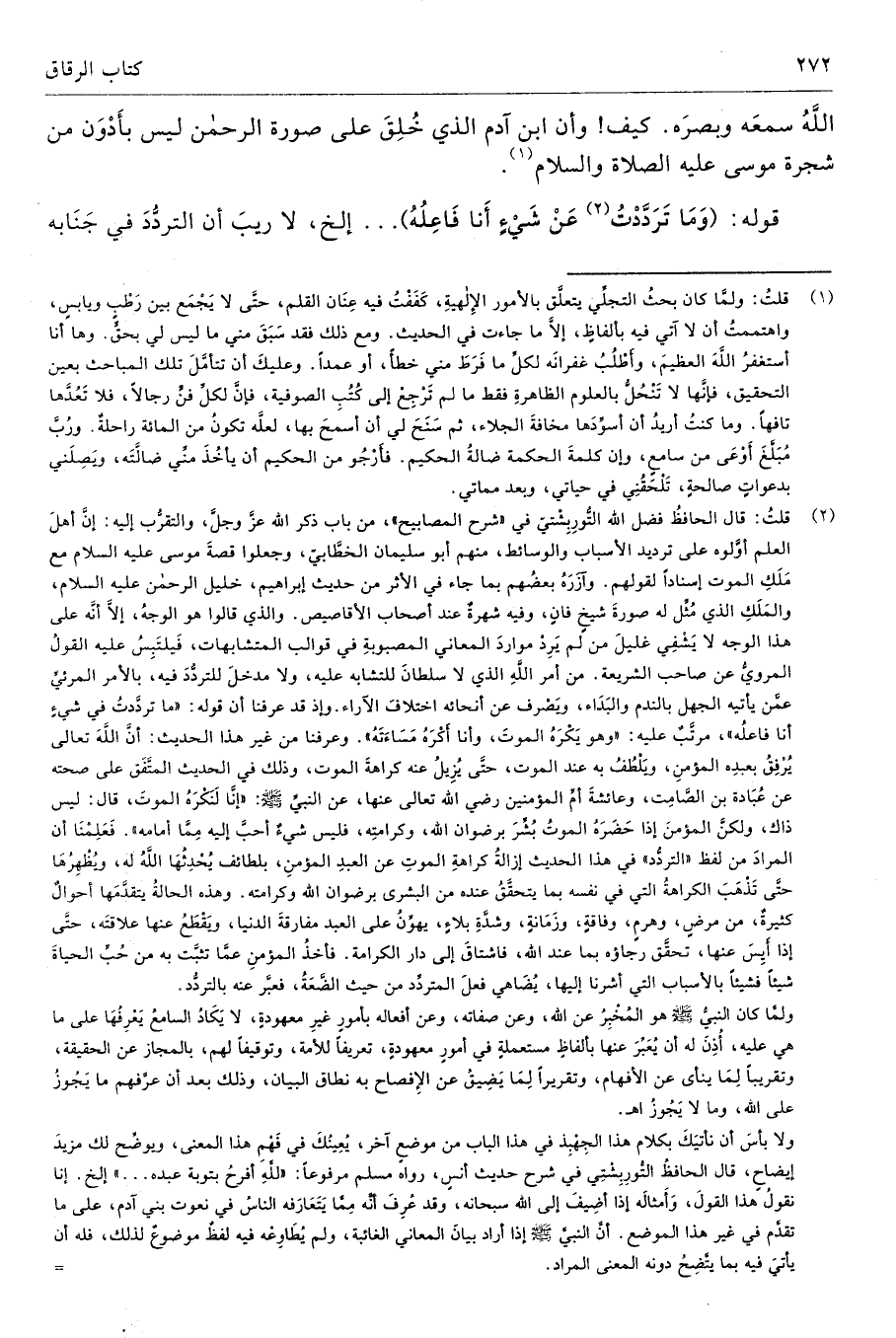 (¬2) قلتُ: قال الحافظُ فضل الله التُّورِبِشتيّ في "شرح المصابيح"، من باب ذكر الله عزَّ وجلَّ، والتقرب إليه: إنَّ أهلَ العلم أوَّلوه على ترديد الأسباب والوسائط، منهم أبو سليمان الخطَّابيّ، وجعلوا قصةَ موسى عليه السلام مع مَلَكِ الموت إسنادًا لقولهم. وآزرَهُ بعضُهم بما جاء في الأثر من حديث إبراهيم، خليل الرحمن عليه السلام، والمَلَكِ الذي مُثل له صورةَ شيخٍ فانٍ، وفيه شهرةٌ عند أصحاب الأقاصيص. والذي قالوا هو الوجهُ، إلَّا أنَّه على هذا الوجه لا يَشْفِي غليلَ من لم يَرِدْ مواردَ المعاني المصبوبةِ في قوالب المتشابهات، فَيلتَبِسُ عليه القولُ المرويُّ عن صاحب الشريعة. من أمر اللهِ الذي لا سلطانَ للتشابه عليه، ولا مدخلَ للتردُّدَ فيه، بالأمر المرئيِّ عمَّن يأتيه الجهل بالندم والبَدَاء، ويَصْرف عن أنحائه اختلافَ الآراء. وإذ قد عرفنا أن قوله: "ما تردَّدتُ في شيءٍ أنا فاعلُه"، مرتَّبٌ عليه: "وهو يَكْرَهُ الموتَ، وأنا أكْرَهُ مَسَاءَتَهُ". وعرفنا من غير هذا الحديث: أن اللهَ تعالى يُرْفِقُ بعبدِه المؤمنِ، ويَلْطُفُ به عند الموت، حتَّى يُزِيلُ عنه كراهةَ الموت، وذلك في الحديث المتَّفَق على صحته عن عُبَادة بن الصَّامِت، وعائشةَ أمِّ المؤمنين رضي الله تعالى عنها، عن النبيِّ - صلى الله عليه وسلم -: "إنَّا لَنَكرَهُ الموتَ، قال: ليس ذاك، ولكنَّ المؤمنَ إذا حَضَرَهُ الموتُ بُشِّرَ برضوان الله، وكرامتِه، فليس شيءٌ أحبَّ إليه مِمَّا أمامه". فَعَلِمْنَا أن المرادَ من لفظ "التردُّد" في هذا الحديث إزالةُ كراهةِ الموتِ عن العبدِ المؤمنِ، بلطائف يُحْدِثُهَا اللهُ له، ويُظْهِرُهَا حتَّى تَذْهبَ الكراهةُ التي في نفسه بما يتحققُ عنده من البشرى برضوان الله وكرامته. وهذه الحالةُ يتقدَّمَها أحوالٌ كثيرةٌ، من مرضٍ، وهرمٍ، وفاقةٍ، وزَمَانةٍ، وشدَّةِ بلاءٍ، يهوِّنُ على العبد مفارقةَ الدنيا، ويَقطَعُ عنها علاقتَه، حتَّى إذا أيِس عنها، تحقَّق رجاؤه بما عند الله، فاشتاقَ إلى دار الكرامة. فأخذُ المؤمنِ عمَّا تثبَّت به من حُبِّ الحياةَ شيئًا فشيئًا بالأسباب التي أشرنا إليها، يُضَاهي فعلَ المتردِّد من حيث الضَّعَةُ، فعبَّر عنه بالتردُّد.