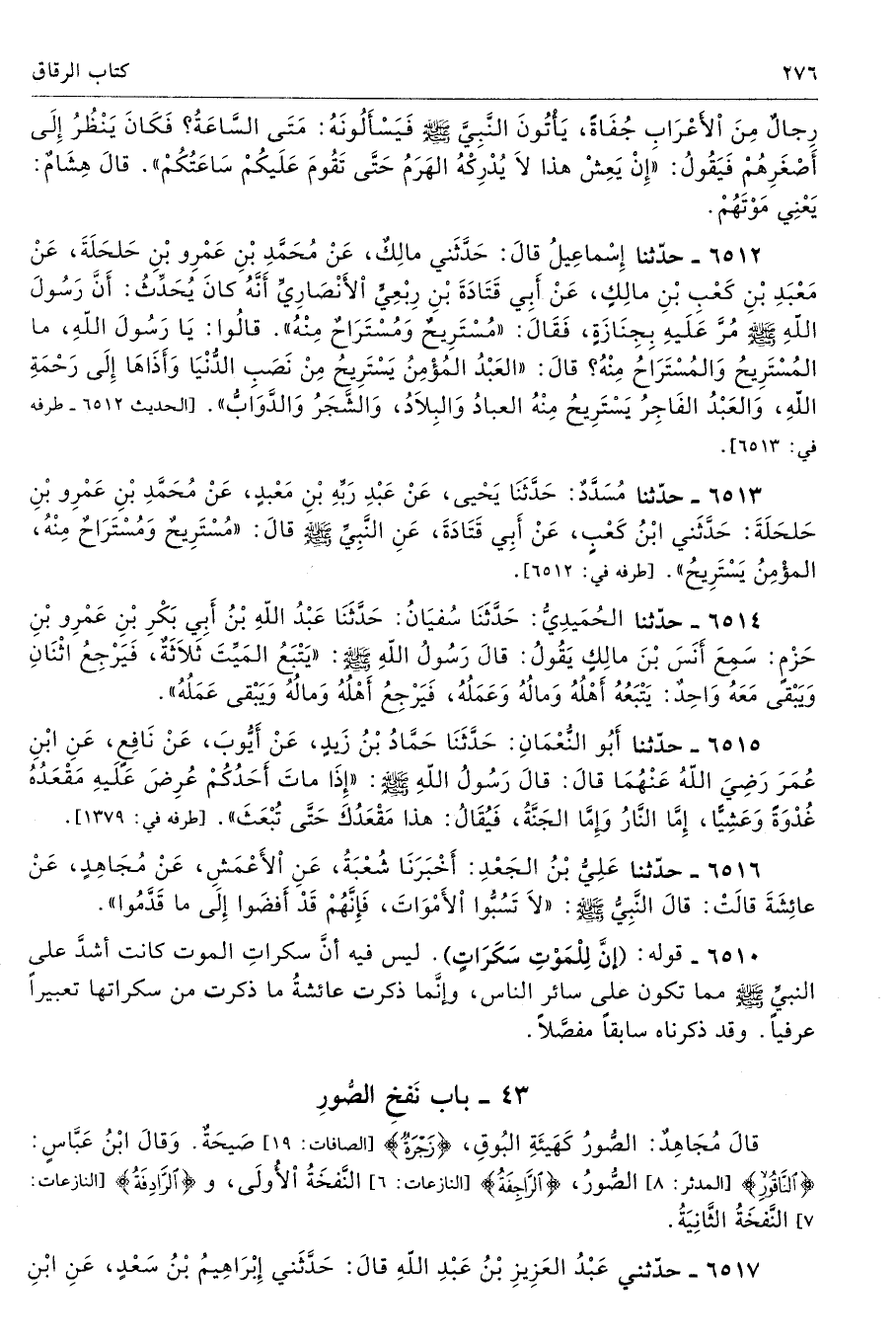 6515 - حَدَّثَنَا أَبُو النُّعْمَانِ حَدَّثَنَا حَمَّادُ بْنُ زَيْدٍ عَنْ أَيُّوبَ عَنْ نَافِعٍ عَنِ ابْنِ عُمَرَ - رضى الله عنهما - قَالَ قَالَ رَسُولُ اللَّهِ - صلى الله عليه وسلم - «إِذَا مَاتَ أَحَدُكُمْ عُرِضَ عَلَيْهِ مَقْعَدُهُ غُدْوَةً وَعَشِيًّا، إِمَّا النَّارُ وَإِمَّا الْجَنَّةُ، فَيُقَالُ هَذَا مَقْعَدُكَ حَتَّى تُبْعَثَ». أطرافه 1379، 3240 - تحفة 7556