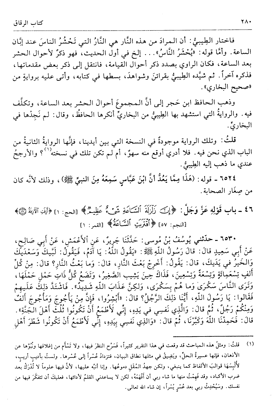 وذهب الحافظ ابن حَجَر إلى أنَّ المجموعَ أحوالَ الحشر بعد الساعة، وتكلَّف فيه. والروايةُ التي استشهد بها الطِيبيُّ من البخاريِّ أنكرها الحافظُ، وقال: لم نَجِدْها في البخاريِّ.