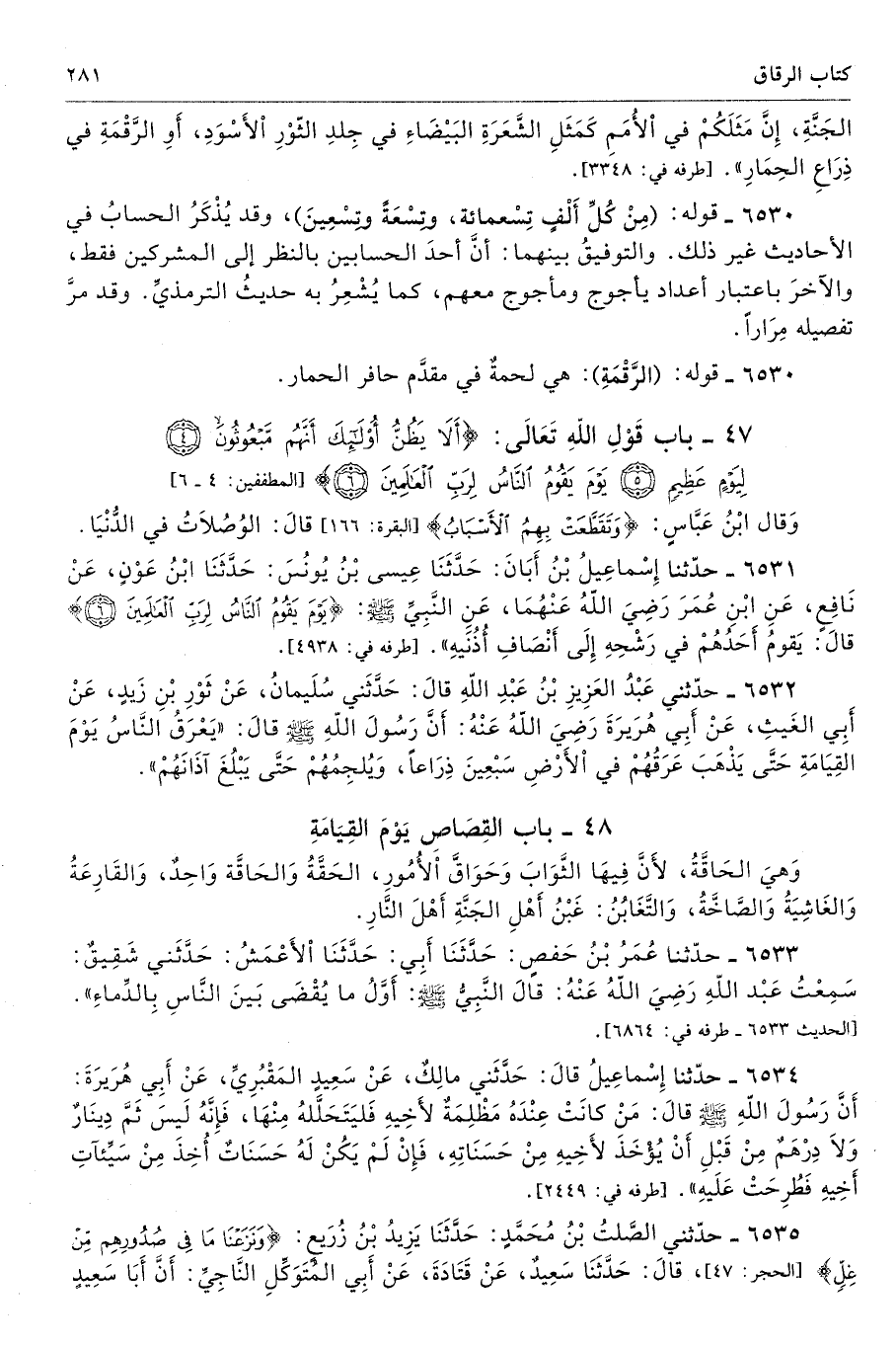 6533 - حَدَّثَنَا عُمَرُ بْنُ حَفْصٍ حَدَّثَنَا أَبِى حَدَّثَنَا الأَعْمَشُ حَدَّثَنِى شَقِيقٌ سَمِعْتُ عَبْدَ اللَّهِ - رضى الله عنه - قَالَ النَّبِىُّ - صلى الله عليه وسلم - «أَوَّلُ مَا يُقْضَى بَيْنَ النَّاسِ بِالدِّمَاءِ». طرفه 6864 - تحفة 9246