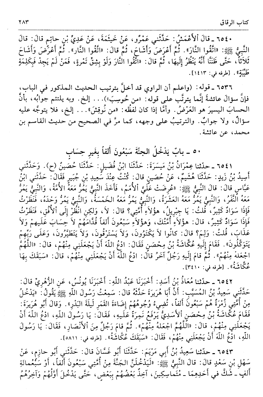 6543 - حَدَّثَنَا سَعِيدُ بْنُ أَبِى مَرْيَمَ حَدَّثَنَا أَبُو غَسَّانَ قَالَ حَدَّثَنِى أَبُو حَازِمٍ عَنْ سَهْلِ بْنِ سَعْدٍ قَالَ قَالَ النَّبِىُّ - صلى الله عليه وسلم - «لَيَدْخُلَنَّ الْجَنَّةَ مِنْ أُمَّتِى سَبْعُونَ أَلْفًا أَوْ سَبْعُمِائَةِ أَلْفٍ - شَكَّ فِى أَحَدِهِمَا - مُتَمَاسِكِينَ، آخِذٌ بَعْضُهُمْ بِبَعْضٍ، حَتَّى يَدْخُلَ أَوَّلُهُمْ وَآخِرُهُمُ