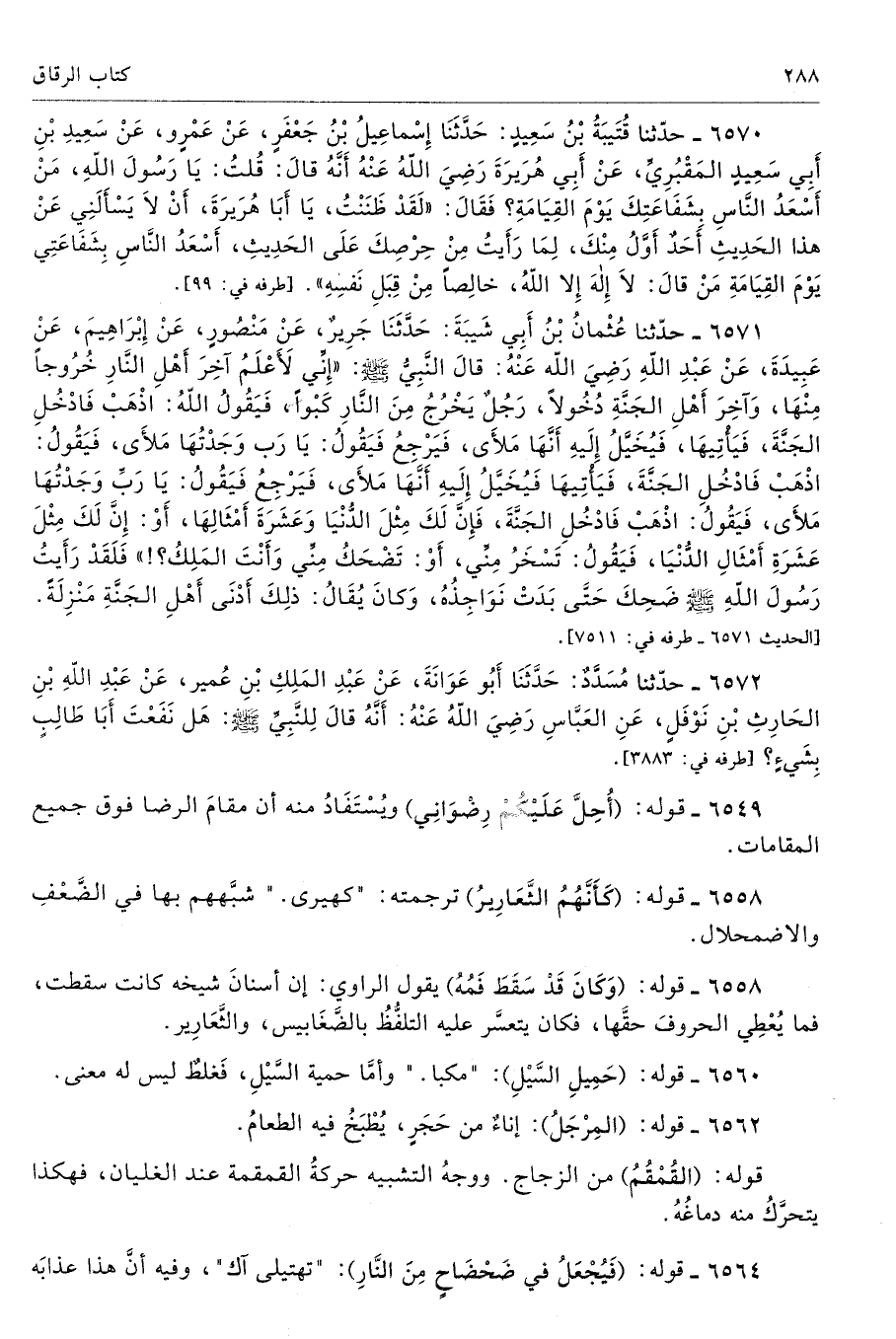 6570 - حَدَّثَنَا قُتَيْبَةُ بْنُ سَعِيدٍ حَدَّثَنَا إِسْمَاعِيلُ بْنُ جَعْفَرٍ عَنْ عَمْرٍو عَنْ سَعِيدِ بْنِ أَبِى سَعِيدٍ الْمَقْبُرِىِّ عَنْ أَبِى هُرَيْرَةَ - رضى الله عنه - أَنَّهُ قَالَ قُلْتُ يَا رَسُولَ اللَّهِ مَنْ أَسْعَدُ النَّاسِ بِشَفَاعَتِكَ يَوْمَ الْقِيَامَةِ فَقَالَ «لَقَدْ ظَنَنْتُ يَا أَبَا هُرَيْرَةَ أَنْ لاَ يَسْأَلَنِى عَنْ هَذَا الْحَدِيثِ أَحَدٌ أَوَّلُ مِنْكَ، لِمَا رَأَيْتُ مِنْ حِرْصِكَ عَلَى الْحَدِيثِ، أَسْعَدُ النَّاسِ بِشَفَاعَتِى يَوْمَ الْقِيَامَةِ مَنْ قَالَ لاَ إِلَهَ إِلاَّ اللَّهُ. خَالِصًا مِنْ قِبَلِ نَفْسِهِ». طرفه 99 - تحفة 13001