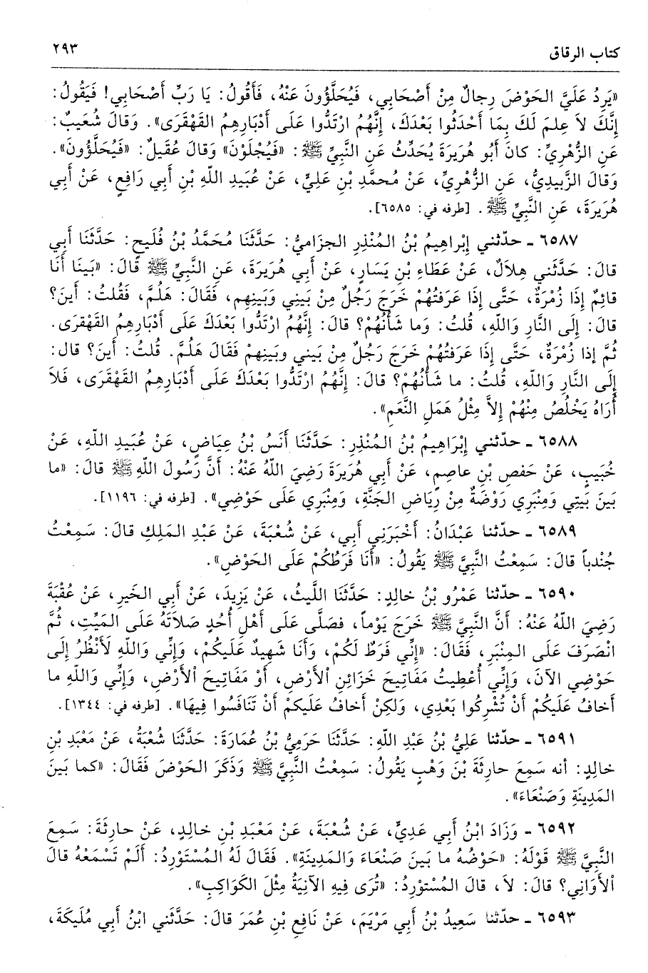 «يَرِدُ عَلَى الْحَوْضِ رِجَالٌ مِنْ أَصْحَابِى فَيُحَلَّئُونَ عَنْهُ فَأَقُولُ يَا رَبِّ أَصْحَابِى. فَيَقُولُ إِنَّكَ لاَ عِلْمَ لَكَ بِمَا أَحْدَثُوا بَعْدَكَ، إِنَّهُمُ ارْتَدُّوا عَلَى أَدْبَارِهِمُ الْقَهْقَرَى». وَقَالَ شُعَيْبٌ عَنِ الزُّهْرِىِّ كَانَ أَبُو هُرَيْرَةَ يُحَدِّثُ عَنِ النَّبِىِّ - صلى الله عليه وسلم - فَيُجْلَوْنَ. وَقَالَ عُقَيْلٌ فَيُحَلَّئُونَ. وَقَالَ الزُّبَيْدِىُّ عَنِ الزُّهْرِىِّ عَنْ مُحَمَّدِ بْنِ عَلِىٍّ عَنْ عُبَيْدِ اللَّهِ بْنِ أَبِى رَافِعٍ عَنْ أَبِى هُرَيْرَةَ عَنِ النَّبِىِّ - صلى الله عليه وسلم -. طرفه 6585 - تحفة 15581، 14602، 14105، 13352