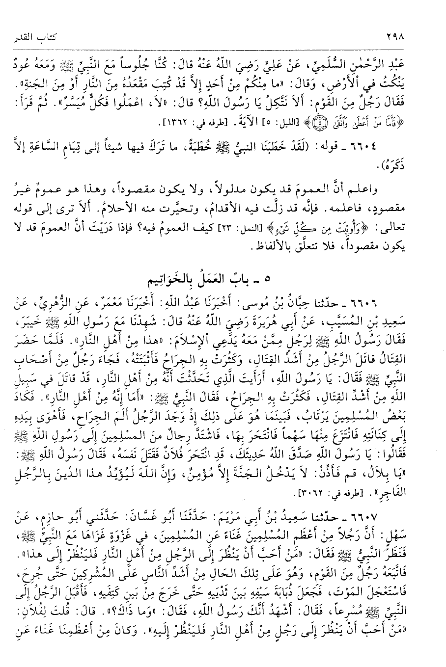 6607 - حَدَّثَنَا سَعِيدُ بْنُ أَبِى مَرْيَمَ حَدَّثَنَا أَبُو غَسَّانَ حَدَّثَنِى أَبُو حَازِمٍ عَنْ سَهْلٍ أَنَّ رَجُلاً مِنْ أَعْظَمِ الْمُسْلِمِينَ غَنَاءً عَنِ الْمُسْلِمِينَ فِى غَزْوَةٍ غَزَاهَا مَعَ النَّبِىِّ - صلى الله عليه وسلم - فَنَظَرَ النَّبِىُّ - صلى الله عليه وسلم - فَقَالَ «مَنْ أَحَبَّ أَنْ يَنْظُرَ إِلَى الرَّجُلِ مِنْ أَهْلِ النَّارِ فَلْيَنْظُرْ إِلَى هَذَا». فَاتَّبَعَهُ رَجُلٌ مِنَ الْقَوْمِ، وَهْوَ عَلَى تِلْكَ الْحَالِ مِنْ أَشَدِّ النَّاسِ عَلَى الْمُشْرِكِينَ، حَتَّى جُرِحَ فَاسْتَعْجَلَ الْمَوْتَ، فَجَعَلَ ذُبَابَةَ سَيْفِهِ بَيْنَ ثَدْيَيْهِ حَتَّى خَرَجَ مِنْ بَيْنِ كَتِفَيْهِ فَأَقْبَلَ الرَّجُلُ إِلَى النَّبِىِّ - صلى الله عليه وسلم - مُسْرِعًا فَقَالَ أَشْهَدُ أَنَّكَ رَسُولُ اللَّهِ. فَقَالَ «وَمَا ذَاكَ». قَالَ قُلْتَ لِفُلاَنٍ «مَنْ أَحَبَّ أَنْ يَنْظُرَ إِلَى رَجُلٍ مِنْ أَهْلِ النَّارِ فَلْيَنْظُرْ إِلَيْهِ». وَكَانَ مِنْ أَعْظَمِنَا غَنَاءً عَنِ