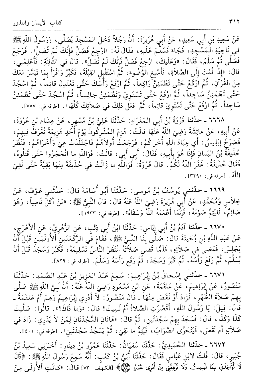 6671 - حَدَّثَنِى إِسْحَاقُ بْنُ إِبْرَاهِيمَ سَمِعَ عَبْدَ الْعَزِيزِ بْنَ عَبْدِ الصَّمَدِ حَدَّثَنَا مَنْصُورٌ عَنْ إِبْرَاهِيمَ عَنْ عَلْقَمَةَ عَنِ ابْنِ مَسْعُودٍ - رضى الله عنه أَنَّ نَبِىَّ اللَّهِ - صلى الله عليه وسلم - صَلَّى بِهِمْ صَلاَةَ الظُّهْرِ، فَزَادَ أَوْ نَقَصَ مِنْهَا - قَالَ مَنْصُورٌ لاَ أَدْرِى إِبْرَاهِيمُ وَهِمَ أَمْ عَلْقَمَةُ - قَالَ قِيلَ يَا رَسُولَ اللَّهِ أَقَصُرَتِ الصَّلاَةُ أَمْ نَسِيتَ قَالَ «وَمَا ذَاكَ». قَالُوا صَلَّيْتَ كَذَا وَكَذَا. قَالَ فَسَجَدَ بِهِمْ سَجْدَتَيْنِ ثُمَّ قَالَ «هَاتَانِ السَّجْدَتَانِ لِمَنْ لاَ يَدْرِى، زَادَ فِى صَلاَتِهِ أَمْ نَقَصَ، فَيَتَحَرَّى الصَّوَابَ، فَيُتِمُّ مَا بَقِىَ، ثُمَّ يَسْجُدُ سَجْدَتَيْنِ». أطرافه 401، 404، 1226، 7249 - تحفة 9451