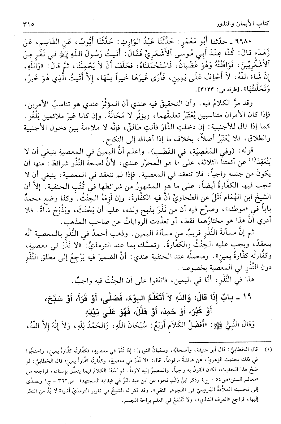 (¬1) قال الخطابيُّ: قال أبو حنيفة، وأصحابُه، وسفيانُ الثوريِّ: إذا نَذَرَ في معصيةٍ، فكفَّارتُه كفَّارةُ يمينٍ، واحتجَّوا في ذلك بحديث الزهريِّ، عن عائشةَ مرفوعًا، قال: "لا نَذْرَ في معصيةٍ، وكفَّارتُه كفَّارةُ يمينٍ" قال الخطابيُّ: لو صَحَّ هذا الحديث، لكان القولُ به واجبًا، والمصير إليه لازمًا. ثم بَسَطَ الكلامَ فيما يتعلَّق بإِسناده، فراجعه من "معالم السنن" ص 54 - ج 4 وذكر ابنُ رُشْدٍ نحوه عن ابن عبد البَرِّ في "بداية المجتهد": ص 362 - ج 1 وتصدَّى إلى تحسينه العلَّامةُ المَردِينيّ في "الجوهر النقي". وقد ذكر له الشيخُ في تقرير الترمذيِّ أشياءٌ لا بُدَّ من النظر إليها، فراجع "العرف الشذي"، ولا تَطْمَعْ في العلم براحة الجسم.