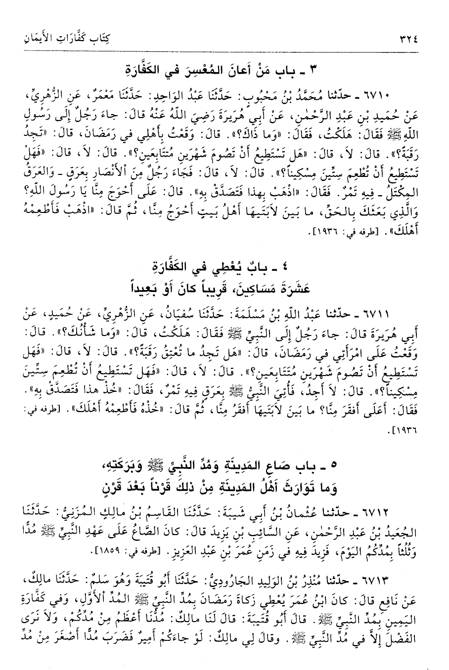6710 - حَدَّثَنَا مُحَمَّدُ بْنُ مَحْبُوبٍ حَدَّثَنَا عَبْدُ الْوَاحِدِ حَدَّثَنَا مَعْمَرٌ عَنِ الزُّهْرِىِّ عَنْ حُمَيْدِ بْنِ عَبْدِ الرَّحْمَنِ عَنْ أَبِى هُرَيْرَةَ - رضى الله عنه - قَالَ جَاءَ رَجُلٌ إِلَى رَسُولِ اللَّهِ - صلى الله عليه وسلم - فَقَالَ هَلَكْتُ. فَقَالَ «وَمَا ذَاكَ». قَالَ وَقَعْتُ بِأَهْلِى فِى رَمَضَانَ. قَالَ «تَجِدُ رَقَبَةً». قَالَ لاَ. قَالَ «هَلْ تَسْتَطِيعُ أَنْ تَصُومَ شَهْرَيْنِ مُتَتَابِعَيْنِ». قَالَ لاَ. قَالَ «فَتَسْتَطِيعُ أَنْ تُطْعِمَ سِتِّينَ مِسْكِينًا». قَالَ لاَ. قَالَ فَجَاءَ رَجُلٌ مِنَ الأَنْصَارِ بِعَرَقٍ - وَالْعَرَقُ الْمِكْتَلُ فِيهِ تَمْرٌ - فَقَالَ «اذْهَبْ بِهَذَا، فَتَصَدَّقْ بِهِ». قَالَ عَلَى أَحْوَجَ مِنَّا يَا رَسُولَ اللَّهِ وَالَّذِى بَعَثَكَ بِالْحَقِّ مَا بَيْنَ لاَبَتَيْهَا أَهْلُ بَيْتٍ أَحْوَجُ مِنَّا. ثُمَّ قَالَ «اذْهَبْ، فَأَطْعِمْهُ أَهْلَكَ». أطرافه 1936، 1037، 2600، 5368، 6087، 6164، 6709، 6711، 6821 تحفة 12275