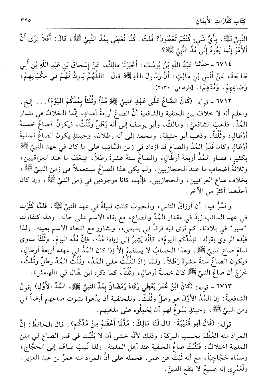 6713 - قوله: (كَانَ ابْنُ عُمَرَ يُعْطِي زَكَاةَ رَمَضَانَ بِمُدِّ النبيِّ صلى الله عليه وسلّم المُدِّ الأَوَّلِ) يقولُ الشافعيةُ: إنص المُدَّ الأوَّلَ هو رطلٌ وثُلُثٌ. وللحنفية أن يدَّعوا بثبوت صاعهم أيضًا في زمن النبيِّ صلى الله عليه وسلّم وحينئذٍ يَسُوغُ لهم أن يَحْمِلُوه على مذهبهم.