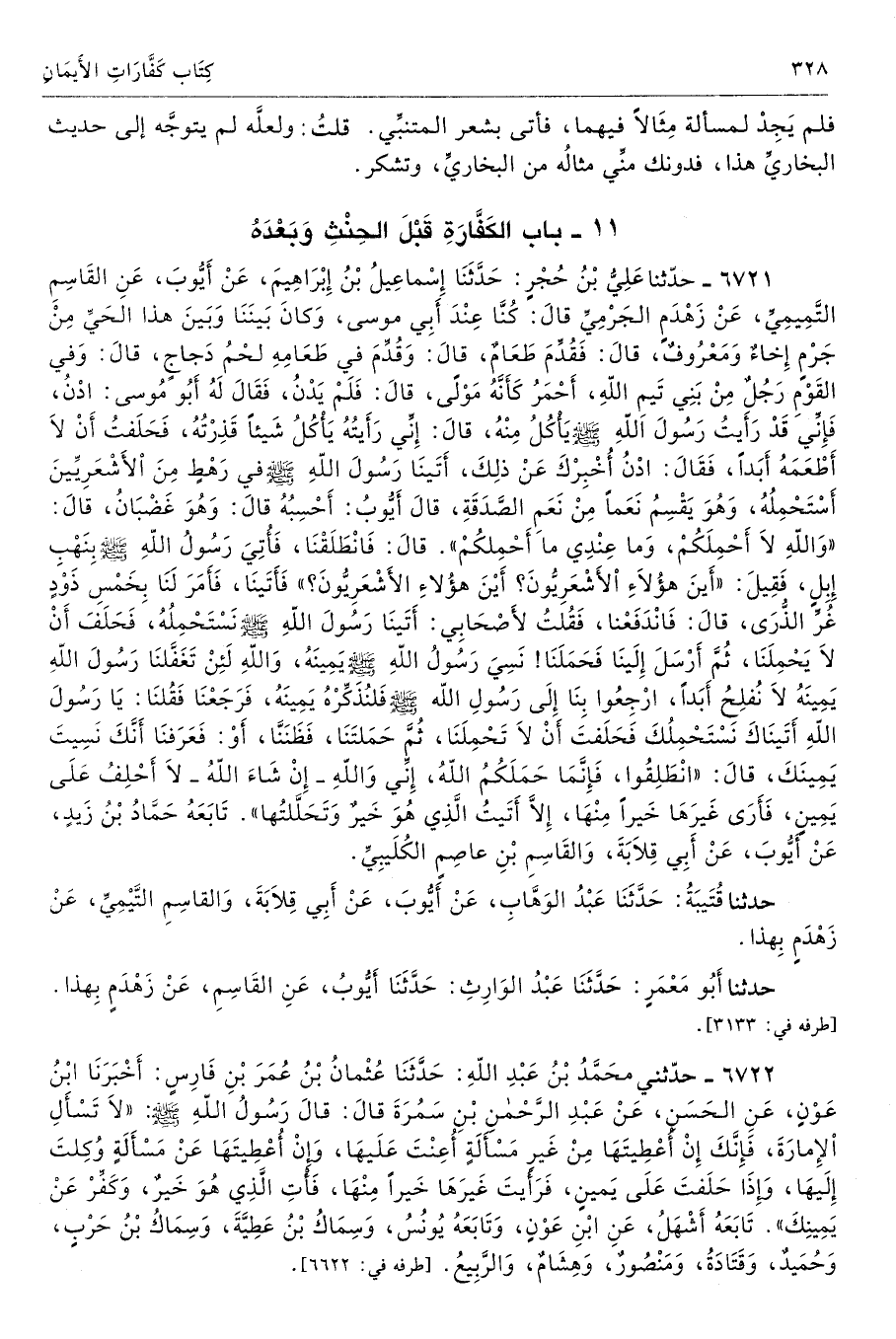 6722 - حَدَّثَنِى مُحَمَّدُ بْنُ عَبْدِ اللَّهِ حَدَّثَنَا عُثْمَانُ بْنُ عُمَرَ بْنِ فَارِسٍ أَخْبَرَنَا ابْنُ عَوْنٍ عَنِ الْحَسَنِ عَنْ عَبْدِ الرَّحْمَنِ بْنِ سَمُرَةَ قَالَ قَالَ رَسُولُ اللَّهِ - صلى الله عليه وسلم - «لاَ تَسْأَلِ الإِمَارَةَ، فَإِنَّكَ إِنْ أُعْطِيتَهَا عَنْ غَيْرِ مَسْأَلَةٍ أُعِنْتَ عَلَيْهَا، وَإِنْ أُعْطِيتَهَا عَنْ مَسْأَلَةٍ وُكِلْتَ إِلَيْهَا، وَإِذَا حَلَفْتَ عَلَى يَمِينٍ فَرَأَيْتَ غَيْرَهَا خَيْرًا مِنْهَا، فَأْتِ الَّذِى هُوَ خَيْرٌ، وَكَفِّرْ عَنْ يَمِينِكَ». تَابَعَهُ أَشْهَلُ عَنِ ابْنِ عَوْنٍ. وَتَابَعَهُ يُونُسُ وَسِمَاكُ بْنُ عَطِيَّةَ وَسِمَاكُ بْنُ حَرْبٍ وَحُمَيْدٌ وَقَتَادَةُ وَمَنْصُورٌ وَهِشَامٌ وَالرَّبِيعُ. أطرافه 6622، 7146، 7147 - تحفة 9695 - 184/ 8