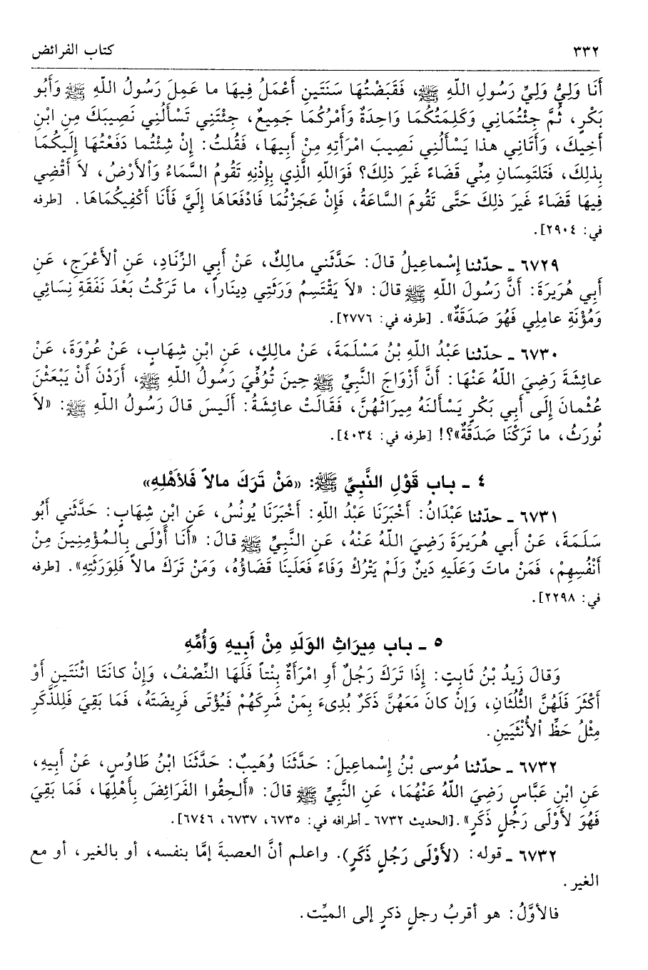 6732 - حَدَّثَنَا مُوسَى بْنُ إِسْمَاعِيلَ حَدَّثَنَا وُهَيْبٌ حَدَّثَنَا ابْنُ طَاوُسٍ عَنْ أَبِيهِ عَنِ ابْنِ عَبَّاسٍ - رضى الله عنهما - عَنِ النَّبِىِّ - صلى الله عليه وسلم - قَالَ «أَلْحِقُوا الْفَرَائِضَ بِأَهْلِهَا، فَمَا بَقِىَ فَهْوَ لأَوْلَى رَجُلٍ ذَكَرٍ». أطرافه 6735، 6737، 6746 - تحفة 5705