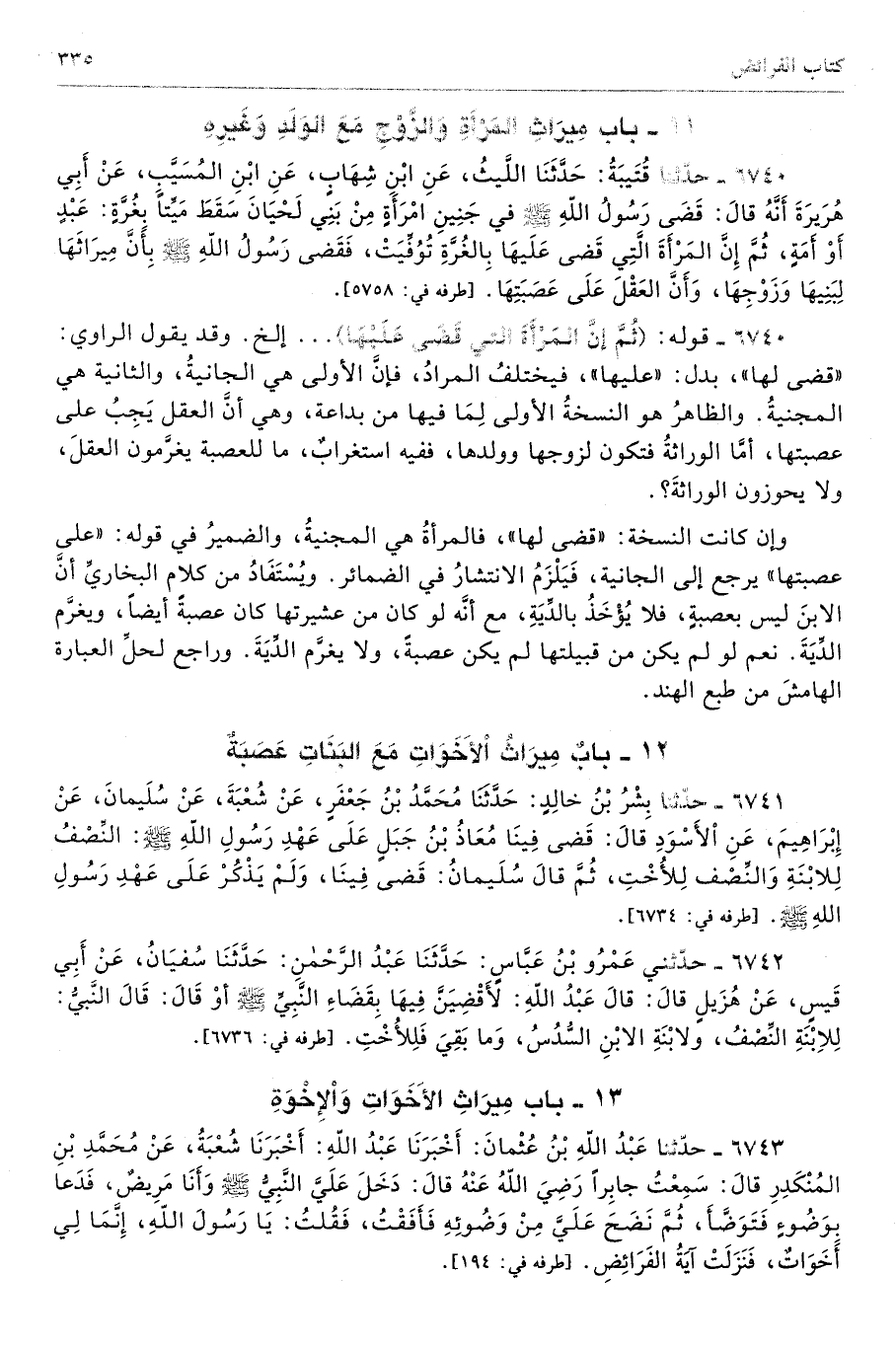 6740 - حَدَّثَنَا قُتَيْبَةُ حَدَّثَنَا اللَّيْثُ عَنِ ابْنِ شِهَابٍ عَنِ ابْنِ الْمُسَيَّبِ عَنْ أَبِى هُرَيْرَةَ أَنَّهُ قَالَ قَضَى رَسُولُ اللَّهِ - صلى الله عليه وسلم - فِى جَنِينِ امْرَأَةٍ مِنْ بَنِى لَحْيَانَ سَقَطَ مَيِّتًا بِغُرَّةٍ عَبْدٍ أَوْ أَمَةٍ. ثُمَّ إِنَّ الْمَرْأَةَ الَّتِى قَضَى عَلَيْهَا بِالْغُرَّةِ تُوُفِّيَتْ، فَقَضَى رَسُولُ اللَّهِ - صلى الله عليه وسلم - «بِأَنَّ مِيرَاثَهَا لِبَنِيهَا وَزَوْجِهَا، وَأَنَّ الْعَقْلَ عَلَى عَصَبَتِهَا». أطرافه 5758، 5759، 5760، 6904، 6909، 6910 - تحفة 13225