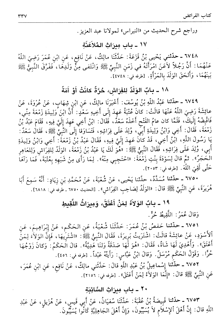 6752 - حَدَّثَنَا إِسْمَاعِيلُ بْنُ عَبْدِ اللَّهِ قَالَ حَدَّثَنِى مَالِكٌ عَنْ نَافِعٍ عَنِ ابْنِ عُمَرَ عَنِ النَّبِىِّ - صلى الله عليه وسلم - قَالَ «إِنَّمَا الْوَلاَءُ لِمَنْ أَعْتَقَ». أطرافه 2156، 2169، 2562، 6757، 6759 - تحفة 8334