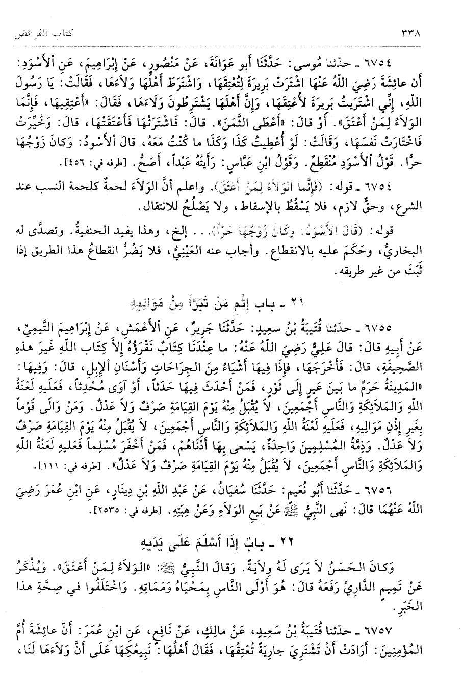 6755 - حَدَّثَنَا قُتَيْبَةُ بْنُ سَعِيدٍ حَدَّثَنَا جَرِيرٌ عَنِ الأَعْمَشِ عَنْ إِبْرَاهِيمَ التَّيْمِىِّ عَنْ أَبِيهِ قَالَ قَالَ عَلِىٌّ - رضى الله عنه مَا عِنْدَنَا كِتَابٌ نَقْرَؤُهُ إِلاَّ كِتَابُ اللَّهِ، غَيْرَ هَذِهِ الصَّحِيفَةِ. قَالَ فَأَخْرَجَهَا فَإِذَا فِيهَا أَشْيَاءُ مِنَ الْجِرَاحَاتِ وَأَسْنَانِ الإِبِلِ. قَالَ وَفِيهَا الْمَدِينَةُ حَرَمٌ مَا بَيْنَ عَيْرٍ إِلَى ثَوْرٍ، فَمَنْ أَحْدَثَ فِيهَا حَدَثًا، أَوْ آوَى مُحْدِثًا، فَعَلَيْهِ لَعْنَةُ اللَّهِ وَالْمَلاَئِكَةِ وَالنَّاسِ أَجْمَعِينَ، لاَ يُقْبَلُ مِنْهُ يَوْمَ الْقِيَامَةِ صَرْفٌ وَلاَ عَدْلٌ، وَمَنْ وَالَى قَوْمًا بِغَيْرِ إِذْنِ مَوَالِيهِ، فَعَلَيْهِ لَعْنَةُ اللَّهِ وَالْمَلاَئِكَةِ وَالنَّاسِ أَجْمَعِينَ، لاَ يُقْبَلُ مِنْهُ يَوْمَ الْقِيَامَةِ صَرْفٌ وَلاَ عَدْلٌ، وَذِمَّةُ الْمُسْلِمِينَ وَاحِدَةٌ، يَسْعَى بِهَا أَدْنَاهُمْ فَمَنْ أَخْفَرَ مُسْلِمًا فَعَلَيْهِ لَعْنَةُ اللَّهِ وَالْمَلاَئِكَةِ وَالنَّاسِ أَجْمَعِينَ، لاَ يُقْبَلُ مِنْهُ يَوْمَ الْقِيَامَةِ صَرْفٌ وَلاَ عَدْلٌ. أطرافه 111، 1870، 3047، 3172، 3179، 6903، 6915، 7300 تحفة 10317
