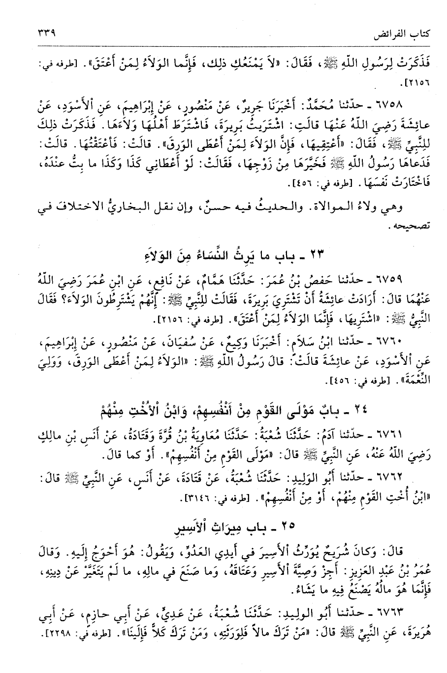 6760 - حَدَّثَنَا ابْنُ سَلاَمٍ أَخْبَرَنَا وَكِيعٌ عَنْ سُفْيَانَ عَنْ مَنْصُورٍ عَنْ إِبْرَاهِيمَ عَنِ الأَسْوَدِ عَنْ عَائِشَةَ قَالَتْ قَالَ رَسُولُ اللَّهِ - صلى الله عليه وسلم - «الْوَلاَءُ لِمَنْ أَعْطَى الْوَرِقَ، وَوَلِىَ النِّعْمَةَ». أطرافه 456، 1493، 2155، 2168، 2536، 2560، 2561، 2563، 2564، 2565، 2578، 2717، 2726، 2729، 2735، 5097، 5279، 5284، 5430، 6717، 6751، 6754، 6758 - تحفة 15991