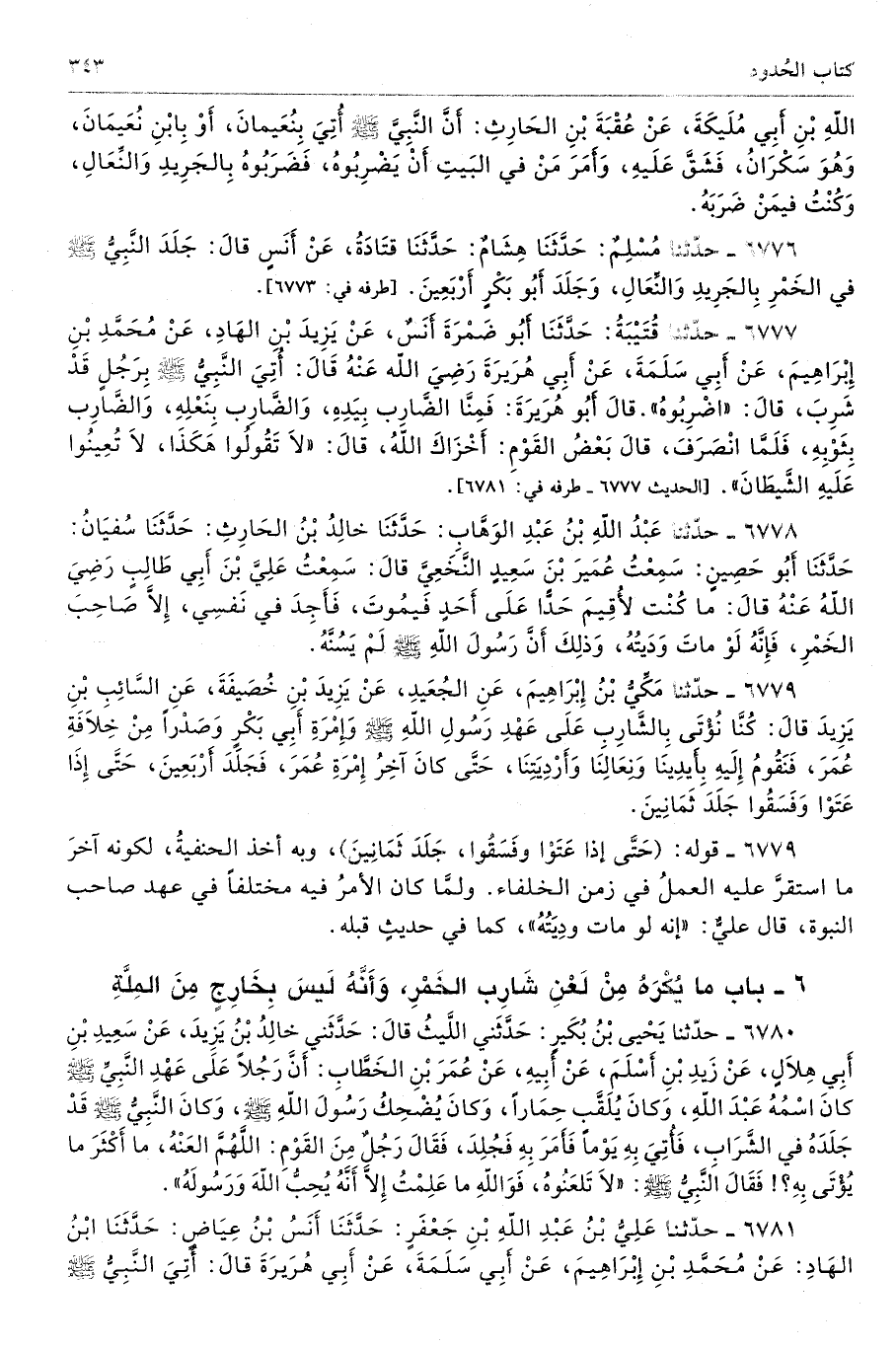 اللَّهِ بْنِ أَبِى مُلَيْكَةَ عَنْ عُقْبَةَ بْنِ الْحَارِثِ أَنَّ النَّبِىَّ - صلى الله عليه وسلم - أُتِىَ بِنُعَيْمَانَ أَوْ بِابْنِ نُعَيْمَانَ وَهْوَ سَكْرَانُ فَشَقَّ عَلَيْهِ، وَأَمَرَ مَنْ فِى الْبَيْتِ أَنْ يَضْرِبُوهُ، فَضَرَبُوهُ بِالْجَرِيدِ وَالنِّعَالِ، وَكُنْتُ فِيمَنْ ضَرَبَهُ. طرفاه 2316، 6774 - تحفة 9907