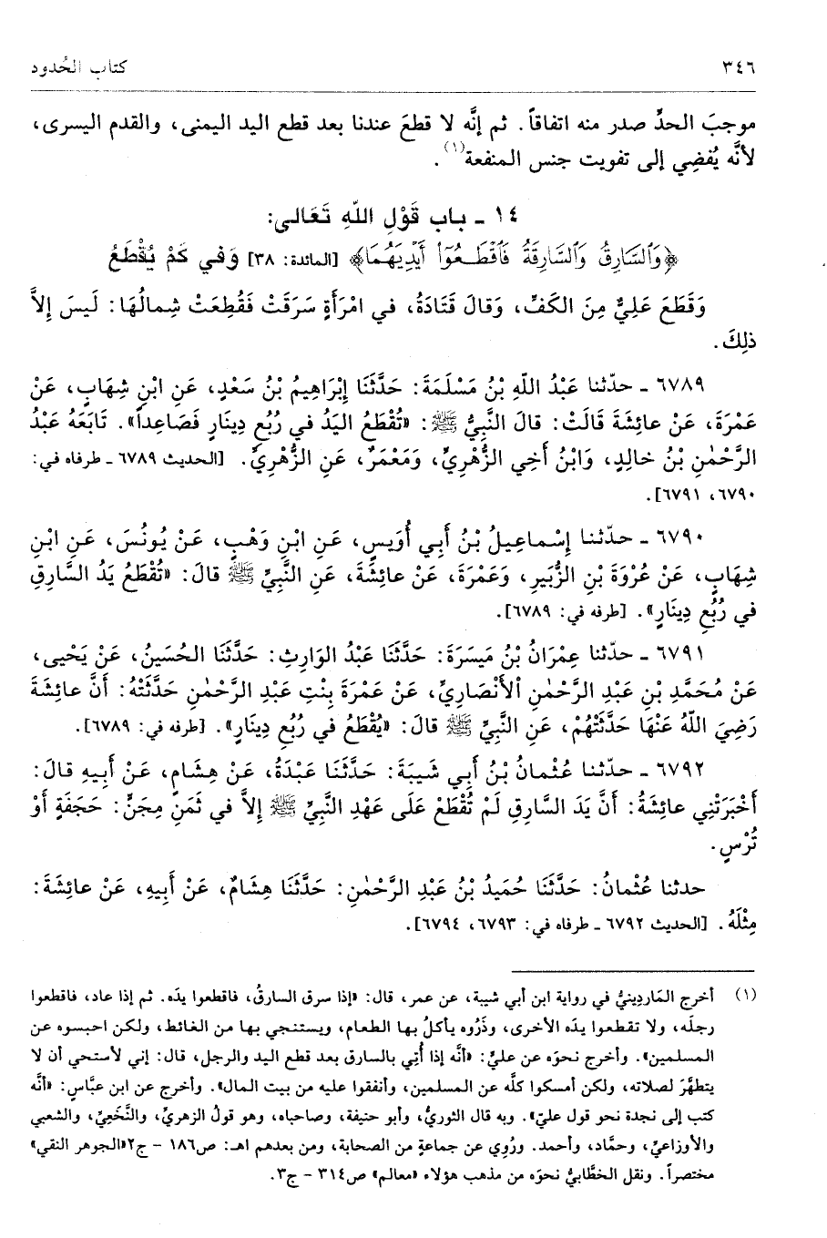 6789 - حَدَّثَنَا عَبْدُ اللَّهِ بْنُ مَسْلَمَةَ حَدَّثَنَا إِبْرَاهِيمُ بْنُ سَعْدٍ عَنِ ابْنِ شِهَابٍ عَنْ عَمْرَةَ عَنْ عَائِشَةَ قَالَ النَّبِىُّ - صلى الله عليه وسلم - «تُقْطَعُ الْيَدُ فِى رُبُعِ دِينَارٍ فَصَاعِدًا». تَابَعَهُ عَبْدُ الرَّحْمَنِ بْنُ خَالِدٍ وَابْنُ أَخِى الزُّهْرِىِّ وَمَعْمَرٌ عَنِ الزُّهْرِىِّ. طرفاه 6790، 6791 - تحفة 17920