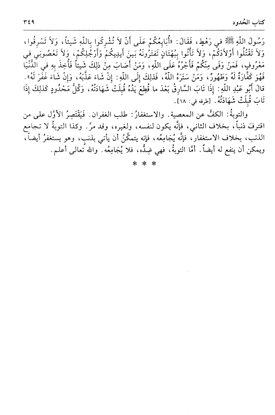 رَسُولَ اللَّهِ - صلى الله عليه وسلم - فِى رَهْطٍ، فَقَالَ «أُبَايِعُكُمْ عَلَى أَنْ لاَ تُشْرِكُوا بِاللَّهِ شَيْئًا، وَلاَ تَسْرِقُوا، وَلاَ تَقْتُلُوا أَوْلاَدَكُمْ، وَلاَ تَأْتُوا بِبُهْتَانٍ تَفْتَرُونَهُ بَيْنَ أَيْدِيكُمْ وَأَرْجُلِكُمْ، وَلاَ تَعْصُونِى فِى مَعْرُوفٍ، فَمَنْ وَفَى مِنْكُمْ فَأَجْرُهُ عَلَى اللَّهِ، وَمَنْ أَصَابَ مِنْ ذَلِكَ شَيْئًا فَأُخِذَ بِهِ فِى الدُّنْيَا فَهْوَ كَفَّارَةٌ لَهُ وَطَهُورٌ، وَمَنْ سَتَرَهُ اللَّهُ فَذَلِكَ إِلَى اللَّهِ، إِنْ شَاءَ عَذَّبَهُ وَإِنْ شَاءَ غَفَرَ لَهُ». قَالَ أَبُو عَبْدِ اللَّهِ إِذَا تَابَ السَّارِقُ بَعْدَ مَا قُطِعَ يَدُهُ، قُبِلَتْ شَهَادَتُهُ، وَكُلُّ مَحْدُودٍ كَذَلِكَ إِذَا تَابَ قُبِلَتْ شَهَادَتُهُ. أطرافه 18، 3892، 3893، 3999، 4894، 6784، 6873، 7055، 7199، 7213، 7468 - تحفة 5094