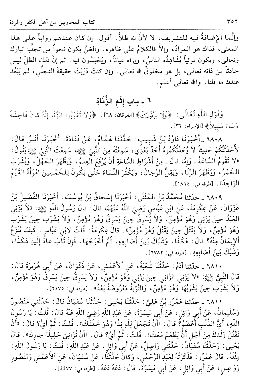 6811 - حَدَّثَنَا عَمْرُو بْنُ عَلِىٍّ حَدَّثَنَا يَحْيَى حَدَّثَنَا سُفْيَانُ قَالَ حَدَّثَنِى مَنْصُورٌ وَسُلَيْمَانُ عَنْ أَبِى وَائِلٍ عَنْ أَبِى مَيْسَرَةَ عَنْ عَبْدِ اللَّهِ - رضى الله عنه - قَالَ قُلْتُ يَا رَسُولَ اللَّهِ أَىُّ الذَّنْبِ أَعْظَمُ قَالَ «أَنْ تَجْعَلَ لِلَّهِ نِدًّا وَهْوَ خَلَقَكَ». قُلْتُ ثُمَّ أَىٌّ قَالَ «أَنْ تَقْتُلَ وَلَدَكَ مِنْ أَجْلِ أَنْ يَطْعَمَ مَعَكَ». قُلْتُ ثُمَّ أَىٌّ قَالَ «أَنْ تُزَانِىَ حَلِيلَةَ جَارِكَ». قَالَ يَحْيَى وَحَدَّثَنَا سُفْيَانُ حَدَّثَنِى وَاصِلٌ عَنْ أَبِى وَائِلٍ عَنْ عَبْدِ اللَّهِ قُلْتُ يَا رَسُولَ اللَّهِ، مِثْلَهُ، قَالَ عَمْرٌو فَذَكَرْتُهُ لِعَبْدِ الرَّحْمَنِ وَكَانَ حَدَّثَنَا عَنْ سُفْيَانَ عَنِ الأَعْمَشِ وَمَنْصُورٍ وَوَاصِلٍ عَنْ أَبِى وَائِلٍ عَنْ أَبِى مَيْسَرَةَ قَالَ دَعْهُ دَعْهُ. أطرافه 4477، 4761، 6001، 6861، 7520، 7532 - تحفة 9480