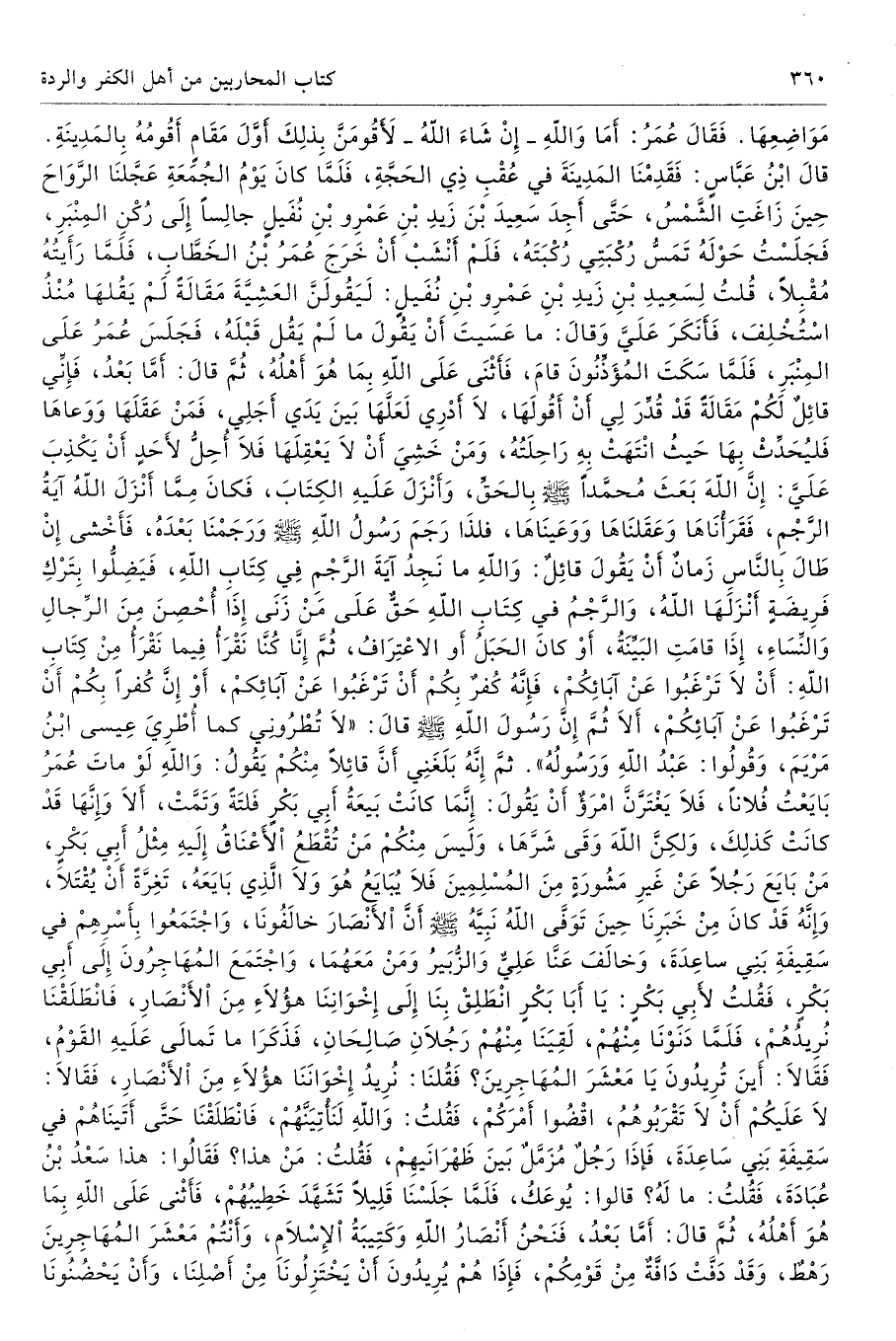 مَوَاضِعِهَا. فَقَالَ عُمَرُ أَمَا وَاللَّهِ إِنْ شَاءَ اللَّهُ لأَقُومَنَّ بِذَلِكَ أَوَّلَ مَقَامٍ أَقُومُهُ بِالْمَدِينَةِ. قَالَ ابْنُ عَبَّاسٍ فَقَدِمْنَا الْمَدِينَةَ فِى عَقِبِ ذِى الْحَجَّةِ، فَلَمَّا كَانَ يَوْمُ الْجُمُعَةِ عَجَّلْنَا الرَّوَاحَ حِينَ زَاغَتِ الشَّمْسُ، حَتَّى أَجِدَ سَعِيدَ بْنَ زَيْدِ بْنِ عَمْرِو بْنِ نُفَيْلٍ جَالِسًا إِلَى رُكْنِ الْمِنْبَرِ، فَجَلَسْتُ حَوْلَهُ تَمَسُّ رُكْبَتِى رُكْبَتَهُ، فَلَمْ أَنْشَبْ أَنْ خَرَجَ عُمَرُ بْنُ الْخَطَّابِ، فَلَمَّا رَأَيْتُهُ مُقْبِلاً قُلْتُ لِسَعِيدِ بْنِ زَيْدِ بْنِ عَمْرِو بْنِ نُفَيْلٍ، لَيَقُولَنَّ الْعَشِيَّةَ مَقَالَةً لَمْ يَقُلْهَا مُنْذُ اسْتُخْلِفَ، فَأَنْكَرَ عَلَىَّ وَقَالَ مَا عَسَيْتَ أَنْ يَقُولَ مَا لَمْ يَقُلْ. قَبْلَهُ فَجَلَسَ عُمَرُ عَلَى الْمِنْبَرِ، فَلَمَّا سَكَتَ الْمُؤَذِّنُونَ قَامَ فَأَثْنَى عَلَى اللَّهِ بِمَا هُوَ أَهْلُهُ قَالَ أَمَّا بَعْدُ فَإِنِّى قَائِلٌ لَكُمْ مَقَالَةً قَدْ قُدِّرَ لِى أَنْ أَقُولَهَا، لاَ أَدْرِى لَعَلَّهَا بَيْنَ يَدَىْ أَجَلِى، فَمَنْ عَقَلَهَا وَوَعَاهَا فَلْيُحَدِّثْ بِهَا حَيْثُ انْتَهَتْ بِهِ رَاحِلَتُهُ، وَمَنْ خَشِىَ أَنْ لاَ يَعْقِلَهَا فَلاَ أُحِلُّ لأَحَدٍ أَنْ يَكْذِبَ عَلَىَّ، إِنَّ اللَّهَ بَعَثَ مُحَمَّدًا - صلى الله عليه وسلم - بِالْحَقِّ وَأَنْزَلَ عَلَيْهِ الْكِتَابَ فَكَانَ مِمَّا أَنْزَلَ اللَّهُ آيَةُ الرَّجْمِ، فَقَرَأْنَاهَا وَعَقَلْنَاهَا وَوَعَيْنَاهَا، رَجَمَ رَسُولُ اللَّهِ - صلى الله عليه وسلم - وَرَجَمْنَا بَعْدَهُ، فَأَخْشَى إِنْ طَالَ بِالنَّاسِ زَمَانٌ أَنْ يَقُولَ قَائِلٌ وَاللَّهِ مَا نَجِدُ آيَةَ الرَّجْمِ فِى كِتَابِ اللَّهِ، فَيَضِلُّوا بِتَرْكِ فَرِيضَةٍ أَنْزَلَهَا اللَّهُ، وَالرَّجْمُ فِى كِتَابِ اللَّهِ حَقٌّ عَلَى مَنْ زَنَى إِذَا أُحْصِنَ مِنَ الرِّجَالِ وَالنِّسَاءِ، إِذَا قَامَتِ الْبَيِّنَةُ أَوْ كَانَ الْحَبَلُ أَوْ الاِعْتِرَافُ، ثُمَّ إِنَّا كُنَّا نَقْرَأُ فِيمَا نَقْرَأُ مِنْ كِتَابِ اللَّهِ أَنْ لاَ تَرْغَبُوا عَنْ آبَائِكُمْ، فَإِنَّهُ كُفْرٌ بِكُمْ أَنْ تَرْغَبُوا عَنْ آبَائِكُمْ، أَوْ إِنَّ كُفْرًا بِكُمْ أَنْ تَرْغَبُوا عَنْ آبَائِكُمْ، أَلاَ ثُمَّ إِنَّ رَسُولَ اللَّهِ - صلى الله عليه وسلم - قَالَ «لاَ تُطْرُونِى كَمَا أُطْرِىَ عِيسَى ابْنُ مَرْيَمَ وَقُولُوا عَبْدُ اللَّهِ وَرَسُولُهُ». ثُمَّ إِنَّهُ بَلَغَنِى أَنَّ قَائِلاً مِنْكُمْ يَقُولُ وَاللَّهِ لَوْ مَاتَ عُمَرُ بَايَعْتُ فُلاَنًا. فَلاَ يَغْتَرَّنَّ امْرُؤٌ أَنْ يَقُولَ إِنَّمَا كَانَتْ بَيْعَةُ أَبِى بَكْرٍ فَلْتَةً وَتَمَّتْ أَلاَ وَإِنَّهَا قَدْ كَانَتْ كَذَلِكَ وَلَكِنَّ اللَّهَ وَقَى شَرَّهَا، وَلَيْسَ مِنْكُمْ مَنْ تُقْطَعُ الأَعْنَاقُ إِلَيْهِ مِثْلُ أَبِى بَكْرٍ، مَنْ بَايَعَ رَجُلاً عَنْ غَيْرِ مَشُورَةٍ مِنَ الْمُسْلِمِينَ فَلاَ يُبَايَعُ هُوَ وَلاَ الَّذِى بَايَعَهُ تَغِرَّةً أَنْ يُقْتَلاَ، وَإِنَّهُ قَدْ كَانَ مِنْ خَبَرِنَا حِينَ تَوَفَّى اللَّهُ نَبِيَّهُ - صلى الله عليه وسلم - إِلاَّ أَنَّ الأَنْصَارَ خَالَفُونَا وَاجْتَمَعُوا بِأَسْرِهِمْ فِى سَقِيفَةِ بَنِى سَاعِدَةَ، وَخَالَفَ عَنَّا عَلِىٌّ وَالزُّبَيْرُ وَمَنْ مَعَهُمَا، وَاجْتَمَعَ الْمُهَاجِرُونَ إِلَى أَبِى بَكْرٍ فَقُلْتُ لأَبِى بَكْرٍ يَا أَبَا بَكْرٍ انْطَلِقْ بِنَا إِلَى إِخْوَانِنَا هَؤُلاَءِ مِنَ الأَنْصَارِ. فَانْطَلَقْنَا نُرِيدُهُمْ فَلَمَّا دَنَوْنَا مِنْهُمْ لَقِيَنَا مِنْهُمْ رَجُلاَنِ صَالِحَانِ، فَذَكَرَا مَا تَمَالَى عَلَيْهِ الْقَوْمُ فَقَالاَ أَيْنَ تُرِيدُونَ يَا مَعْشَرَ الْمُهَاجِرِينَ فَقُلْنَا نُرِيدُ إِخْوَانَنَا 