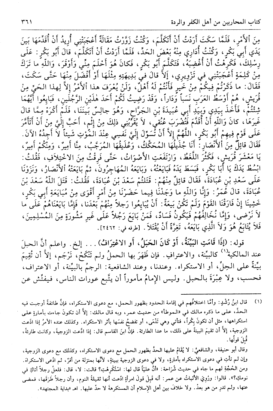 قوله: (إذَا قَامَتِ البَيِّنَةُ، أَوْ كَانَ الحَبَلُ، أَوْ الاعْتِرَافُ) ... إلخ. واعلم أنَّ الحبلَ عند المالكية (¬1) كالبيِّنة، والاعترافِ. فإن ظَهَرَ بها الحملُ ولم تَنْكَحْ، تَرْجَم، إلَّا أن تُقِيمَ بيِّنةً على الحِلِّ، أو الاستكراه. وعندنا، وعند الشافعية: الرجمُ بالبيِّنة، أو الاعراف، فحسب، ولا عِبْرَةَ بالحبل. وليس الإِمامُ مأمورًا أن يتَّبع عورات الناس، فيفتِّش عن