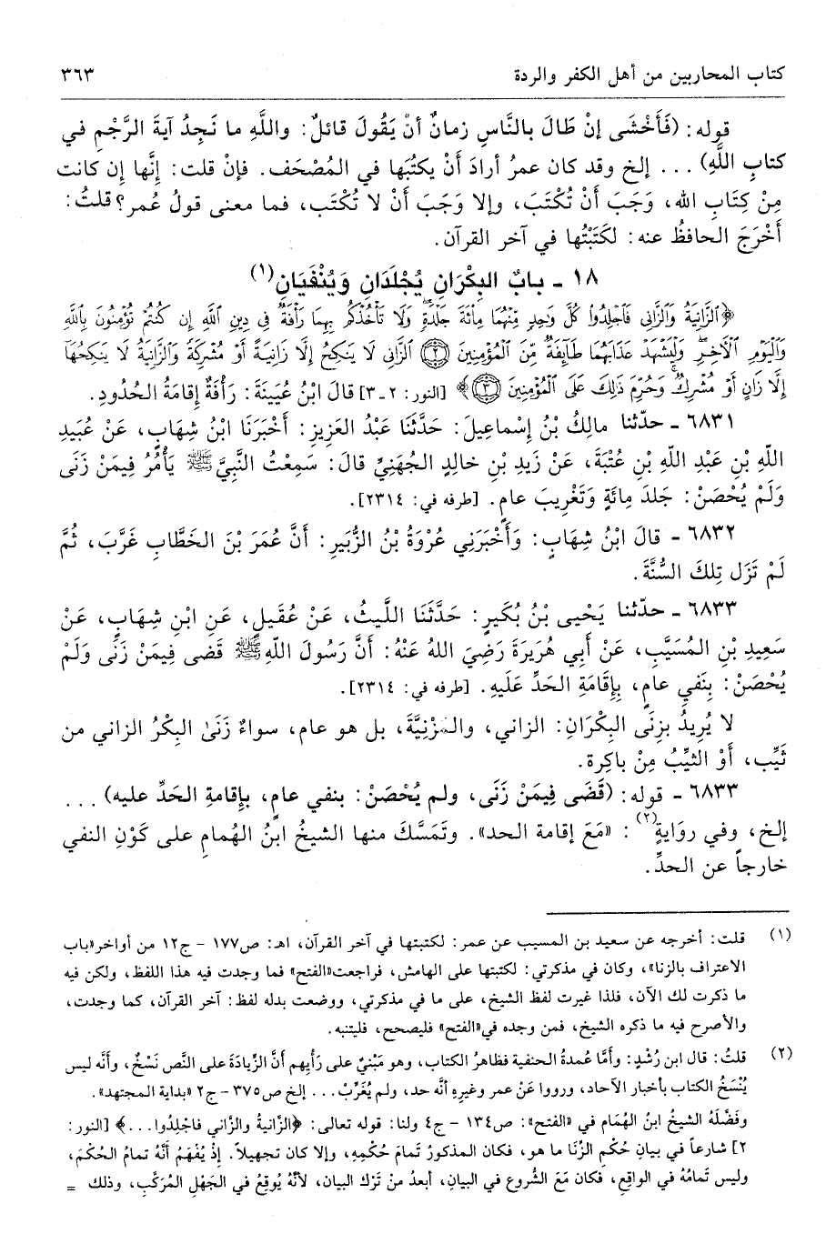 قلتُ: أمَّا ما ذكَرَهُ الحافظُ العلامةُ في الرجم، فلا نُسلِّم أَن الآيةَ خالية عنه، كيف! وحالُ الرَّجْم مع الجَلْد ليس كحالِ الجَلدِ مع التغريبِ عندَهُم. وهل يجبُ عند الشافعيةِ الجَلْدُ مع الرَّجْمِ؟ ثمَّ الرَّجْمُ ثابثٌ من كتابِ الله، والإِجماع على ما سبَقَ في غَيرِ واحدٍ مِنْ أحاديث البخاري، وباحث في الصحابةُ رضي الله تعالى عنهم، حتى يَخْلُصَ الأمر إلى أنَّه حقٌ ثابتٌ، ولولا مخافة الناسِ، لَكَتَبَها عمر في آخر القرآن.