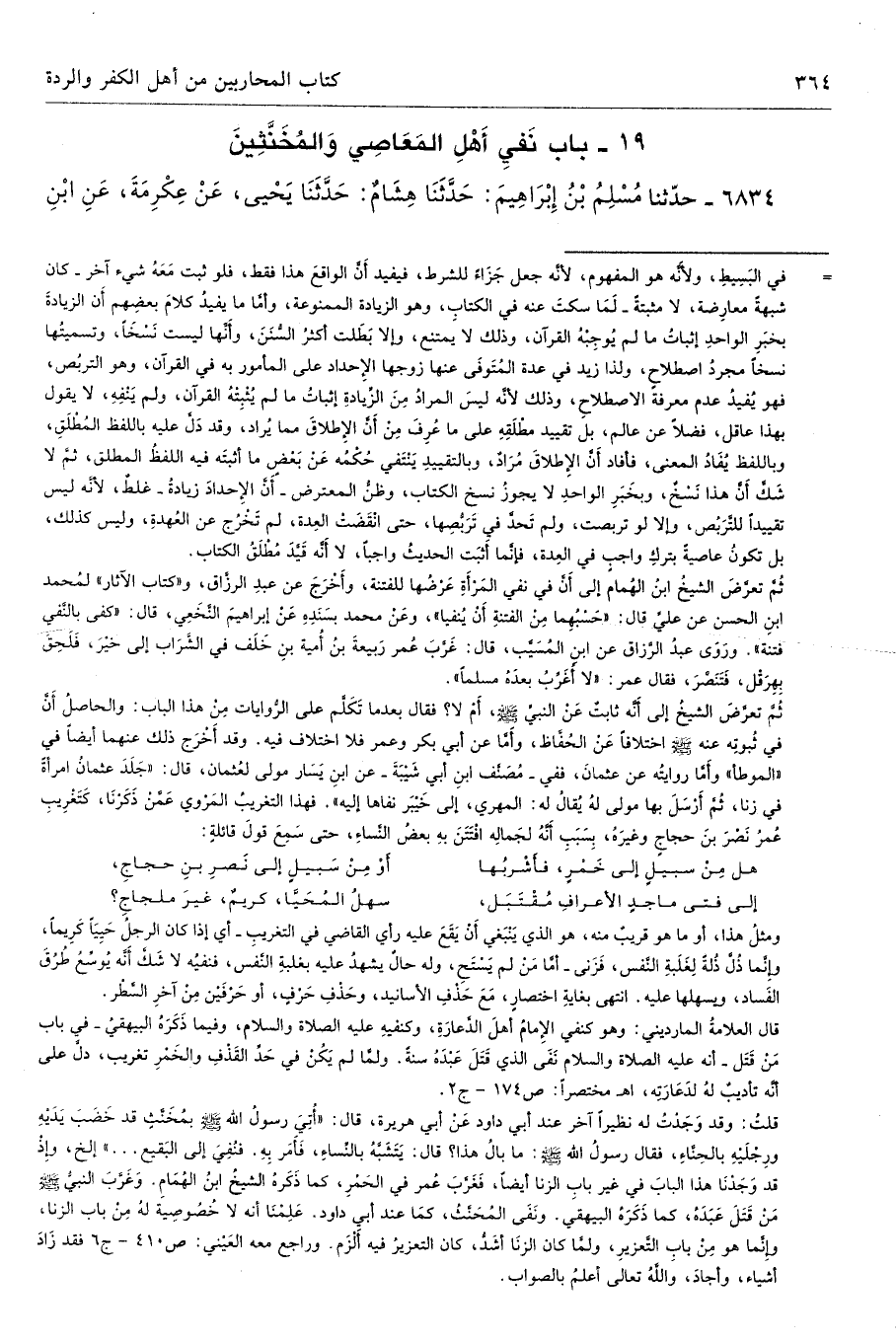 ومثل هذا، أو ما هو قريبٌ منه، هو الذي يَنْبَغي أَنْ يَقَعَ عليه رأي القاضي في التغريبِ -أي إذا كان الرجلُ حَيِيَاً كَرِيمًا، وإِنَّما ذُلَّ ذُلةً لِغَلَبةِ النَّفس، فَزَنى- أمَّا مَنْ لم يَسْتَحِ، وله حالٌ يشهدُ عليه بغلبةِ النَّفس، فنفيُه لا شَكَّ أَنَّه يُوسِّعُ طُرُقَ الفَساد، ويسهلها عليه. انتهى بغايةِ اختصارٍ، مَعَ حَذْفِ الأسانيد، وحَذفِ حَرْفٍ، أو حَرْفَيْن مِنْ آخرِ السَّطْر.
