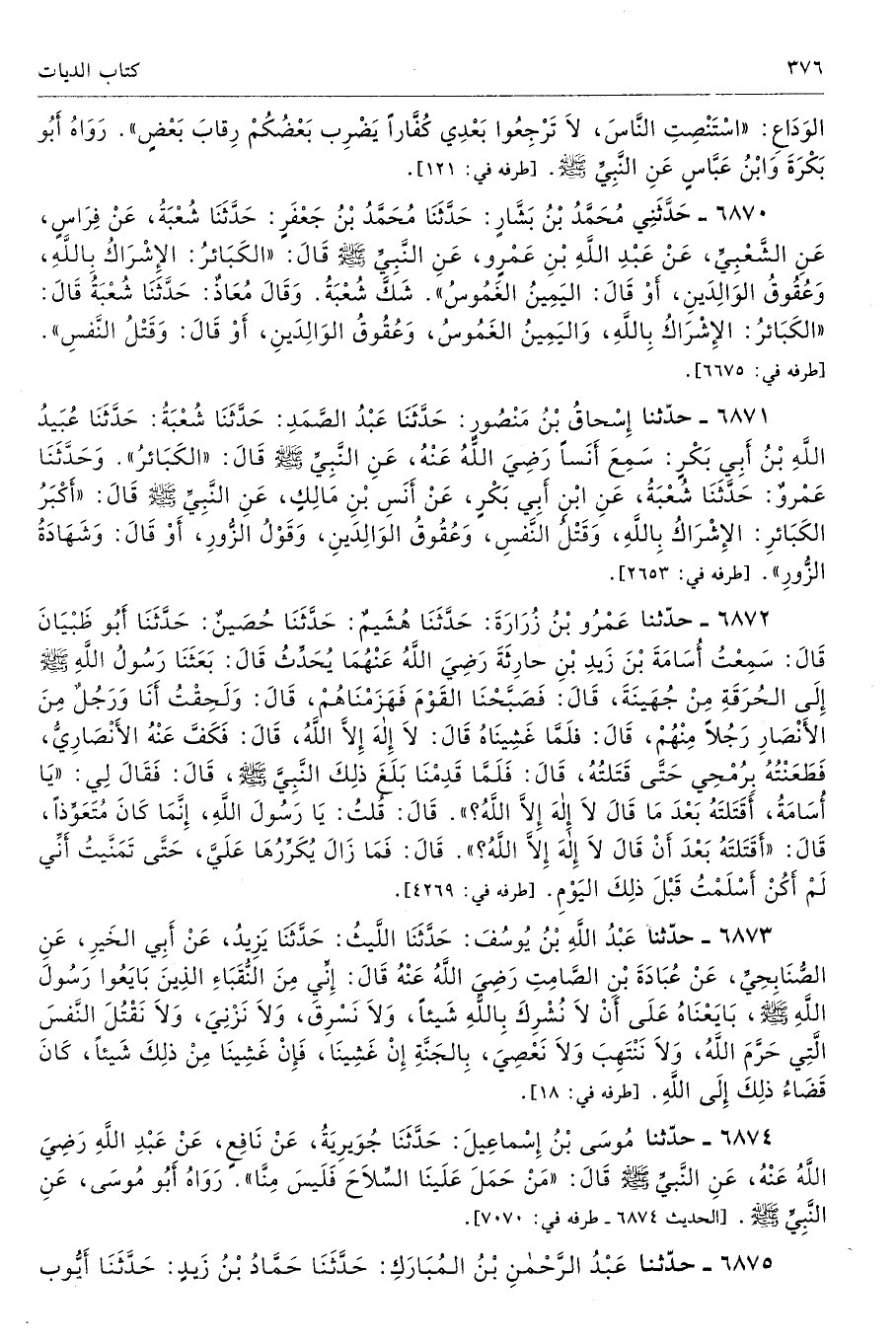 6870 - حَدَّثَنِى مُحَمَّدُ بْنُ بَشَّارٍ حَدَّثَنَا مُحَمَّدُ بْنُ جَعْفَرٍ حَدَّثَنَا شُعْبَةُ عَنْ فِرَاسٍ عَنِ الشَّعْبِىِّ عَنْ عَبْدِ اللَّهِ بْنِ عَمْرٍو عَنِ النَّبِىِّ - صلى الله عليه وسلم - قَالَ «الْكَبَائِرُ الإِشْرَاكُ بِاللَّهِ، وَعُقُوقُ الْوَالِدَيْنِ». أَوْ قَالَ «الْيَمِينُ الْغَمُوسُ». شَكَّ شُعْبَةُ. وَقَالَ مُعَاذٌ حَدَّثَنَا شُعْبَةُ قَالَ «الْكَبَائِرُ الإِشْرَاكُ بِاللَّهِ، وَالْيَمِينُ الْغَمُوسُ، وَعُقُوقُ الْوَالِدَيْنِ». أَوْ قَالَ «وَقَتْلُ النَّفْسِ». طرفاه 6675، 6920 - تحفة 8835