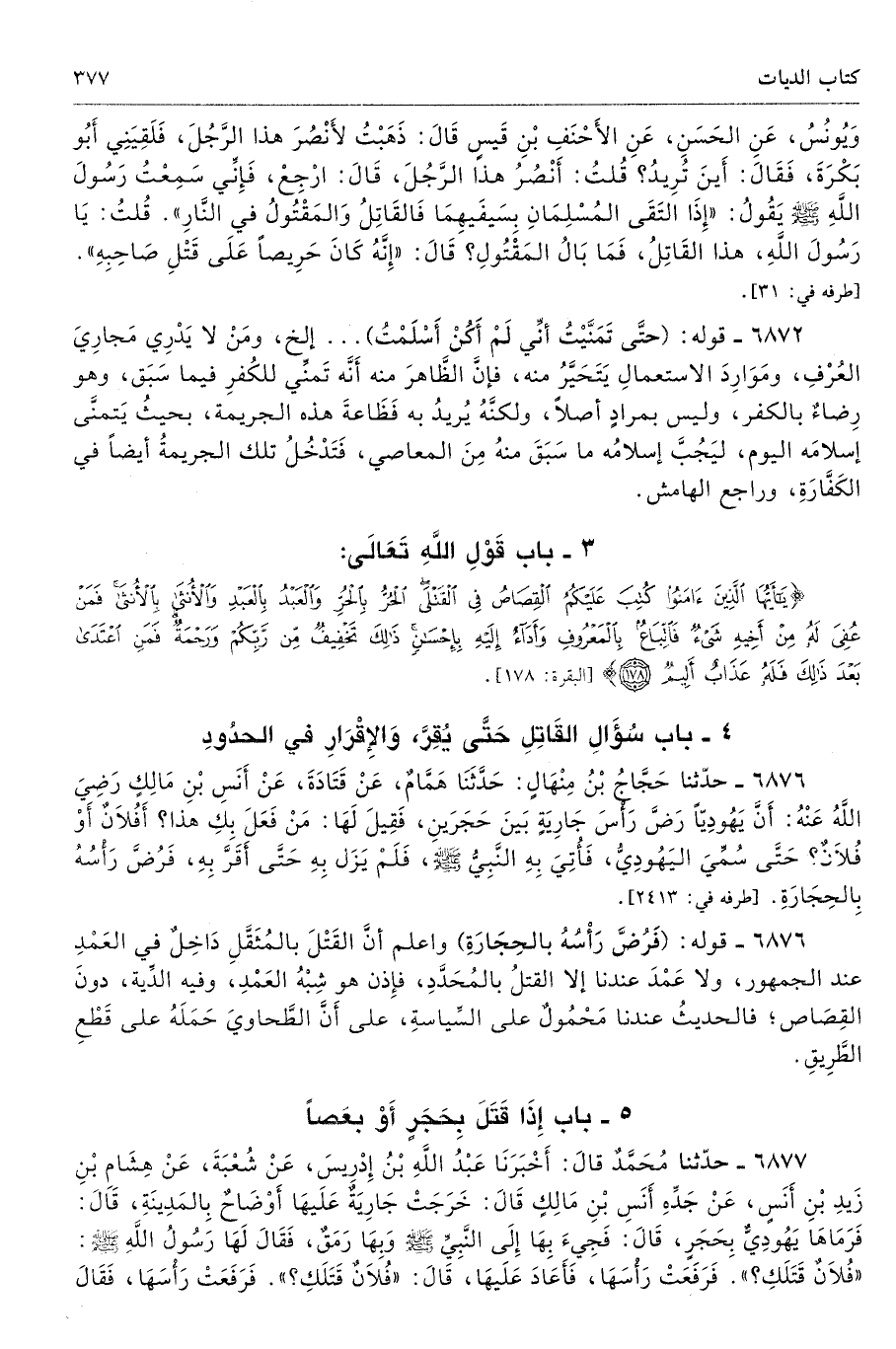 3 - باب قَوْلِ اللَّهِ تَعَالَى: {يَا أَيُّهَا الَّذِينَ آمَنُوا كُتِبَ عَلَيْكُمُ الْقِصَاصُ فِي الْقَتْلَى الْحُرُّ بِالْحُرِّ وَالْعَبْدُ بِالْعَبْدِ وَالْأُنْثَى بِالْأُنْثَى فَمَنْ عُفِيَ لَهُ مِنْ أَخِيهِ شَيْءٌ فَاتِّبَاعٌ بِالْمَعْرُوفِ وَأَدَاءٌ إِلَيْهِ بِإِحْسَانٍ ذَلِكَ تَخْفِيفٌ مِنْ رَبِّكُمْ وَرَحْمَةٌ فَمَنِ اعْتَدَى بَعْدَ ذَلِكَ فَلَهُ عَذَابٌ أَلِيمٌ (178)} [البقرة: 178]