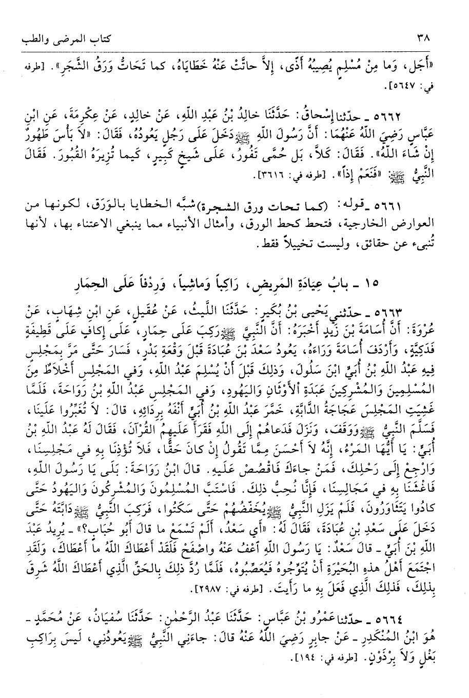«أَجَلْ، وَمَا مِنْ مُسْلِمٍ يُصِيبُهُ أَذًى إِلاَّ حَاتَّتْ عَنْهُ خَطَايَاهُ كَمَا تَحَاتُّ وَرَقُ الشَّجَرِ». أطرافه 5647، 5648، 5660، 5667 - تحفة 9191