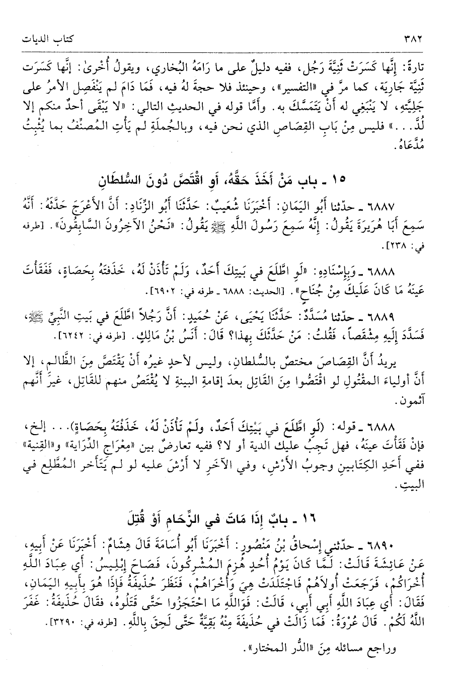 6888 - قوله: (لَوِ اطَّلَعَ في بَيْتِكَ أَحَدٌ، ولَمْ تَأْذَنْ لَهُ، خَذَفْتَهُ بِحَصَاةٍ) ... إلخ، فإنْ فَقَأْتَ عينَهُ، فهل تَجِبُ عليك الدية أو لا؟ ففيه تعارضٌ بين «مِعْرَاجِ الدِّرَاية» و «القِنية» ففي أَحَدِ الكِتَابينِ وجوبُ الأَرْشِ، وفي الآخَرِ لا أَرْشَ عليه لو لم يَتَأَخر المُطَّلِع في البيتِ.