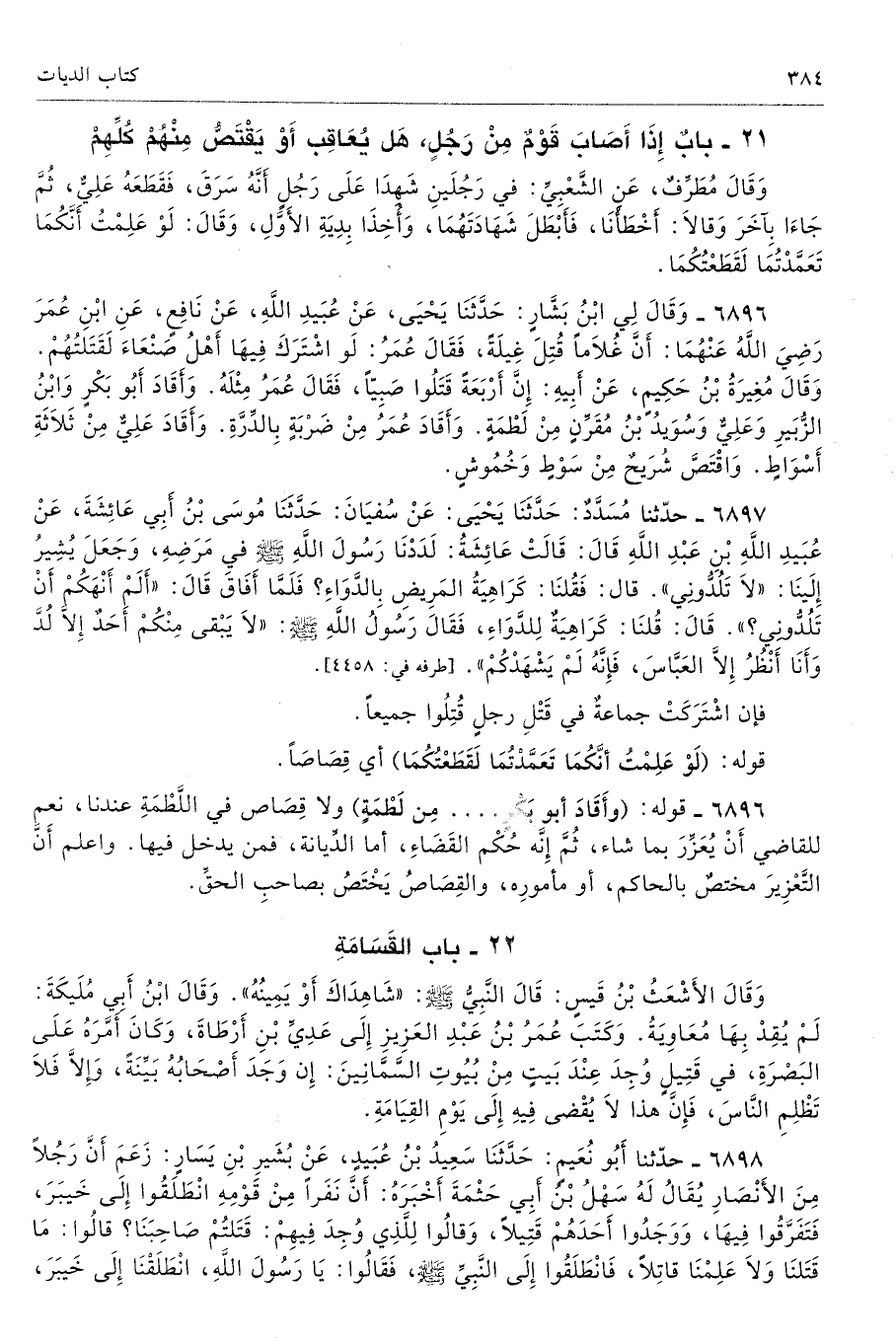 6896 - وَقَالَ لِى ابْنُ بَشَّارٍ حَدَّثَنَا يَحْيَى عَنْ عُبَيْدِ اللَّهِ عَنْ نَافِعٍ عَنِ ابْنِ عُمَرَ - رضى الله عنهما - أَنَّ غُلاَمًا قُتِلَ غِيلَةً فَقَالَ عُمَرُ لَوِ اشْتَرَكَ فِيهَا أَهْلُ صَنْعَاءَ لَقَتَلْتُهُمْ. وَقَالَ مُغِيرَةُ بْنُ حَكِيمٍ عَنْ أَبِيهِ إِنَّ أَرْبَعَةً قَتَلُوا صَبِيًّا فَقَالَ عُمَرُ مِثْلَهُ. وَأَقَادَ أَبُو بَكْرٍ وَابْنُ الزُّبَيْرِ وَعَلِىٌّ وَسُوَيْدُ بْنُ مُقَرِّنٍ مِنْ لَطْمَةٍ. وَأَقَادَ عُمَرُ مِنْ ضَرْبَةٍ بِالدِّرَّةِ. وَأَقَادَ عَلِىٌّ مِنْ ثَلاَثَةِ أَسْوَاطٍ. وَاقْتَصَّ شُرَيْحٌ مِنْ سَوْطٍ وَخُمُوشٍ. تحفة 10562، 10434، 18588