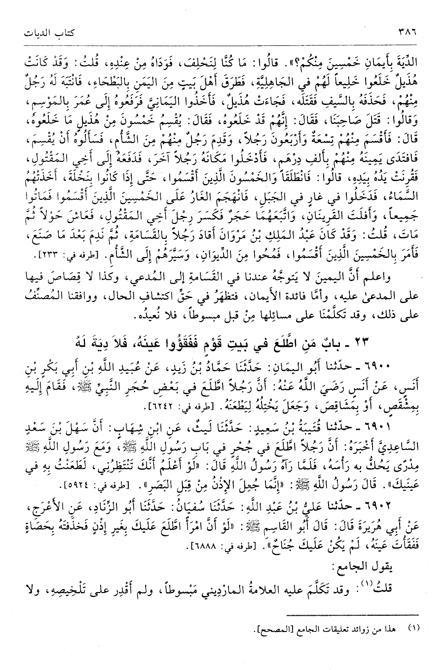 الدِّيَةَ بِأَيْمَانِ خَمْسِينَ مِنْكُمْ». قَالُوا مَا كُنَّا لِنَحْلِفَ، فَوَدَاهُ مِنْ عِنْدِهِ. قُلْتُ وَقَدْ كَانَتْ هُذَيْلٌ خَلَعُوا خَلِيعًا لَهُمْ فِى الْجَاهِلِيَّةِ فَطَرَقَ أَهْلَ بَيْتٍ مِنَ الْيَمَنِ بِالْبَطْحَاءِ فَانْتَبَهَ لَهُ رَجُلٌ مِنْهُمْ فَحَذَفَهُ بِالسَّيْفِ فَقَتَلَهُ، فَجَاءَتْ هُذَيْلٌ فَأَخَذُوا الْيَمَانِىَ فَرَفَعُوهُ إِلَى عُمَرَ بِالْمَوْسِمِ وَقَالُوا قَتَلَ صَاحِبَنَا. فَقَالَ إِنَّهُمْ قَدْ خَلَعُوهُ. فَقَالَ يُقْسِمُ خَمْسُونَ مِنْ هُذَيْلٍ مَا خَلَعُوهُ. قَالَ فَأَقْسَمَ مِنْهُمْ تِسْعَةٌ وَأَرْبَعُونَ رَجُلًا، وَقَدِمَ رَجُلٌ مِنْهُمْ مِنَ الشَّأْمِ فَسَأَلُوهُ أَنْ يُقْسِمَ فَافْتَدَى يَمِينَهُ مِنْهُمْ بِأَلْفِ دِرْهَمٍ، فَأَدْخَلُوا مَكَانَهُ رَجُلًا آخَرَ، فَدَفَعَهُ إِلَى أَخِى الْمَقْتُولِ فَقُرِنَتْ يَدُهُ بِيَدِهِ، قَالُوا فَانْطَلَقَا وَالْخَمْسُونَ الَّذِينَ أَقْسَمُوا حَتَّى إِذَا كَانُوا بِنَخْلَةَ، أَخَذَتْهُمُ السَّمَاءُ فَدَخَلُوا فِى غَارٍ فِى الْجَبَلِ، فَانْهَجَمَ الْغَارُ عَلَى الْخَمْسِينَ الَّذِينَ أَقْسَمُوا فَمَاتُوا جَمِيعًا، وَأَفْلَتَ الْقَرِينَانِ وَاتَّبَعَهُمَا حَجَرٌ فَكَسَرَ رِجْلَ أَخِى الْمَقْتُولِ، فَعَاشَ حَوْلًا ثُمَّ مَاتَ. قُلْتُ وَقَدْ كَانَ عَبْدُ الْمَلِكِ بْنُ مَرْوَانَ أَقَادَ رَجُلًا بِالْقَسَامَةِ ثُمَّ نَدِمَ بَعْدَ مَا صَنَعَ، فَأَمَرَ بِالْخَمْسِينَ الَّذِينَ أَقْسَمُوا فَمُحُوا مِنَ الدِّيوَانِ وَسَيَّرَهُمْ إِلَى الشَّأْمِ. أطرافه 233، 1501، 3018، 4192، 4193، 4610، 5685، 5686، 5727، 6802، 6803، 6804، 6805 - تحفة 945 - 13/ 9
