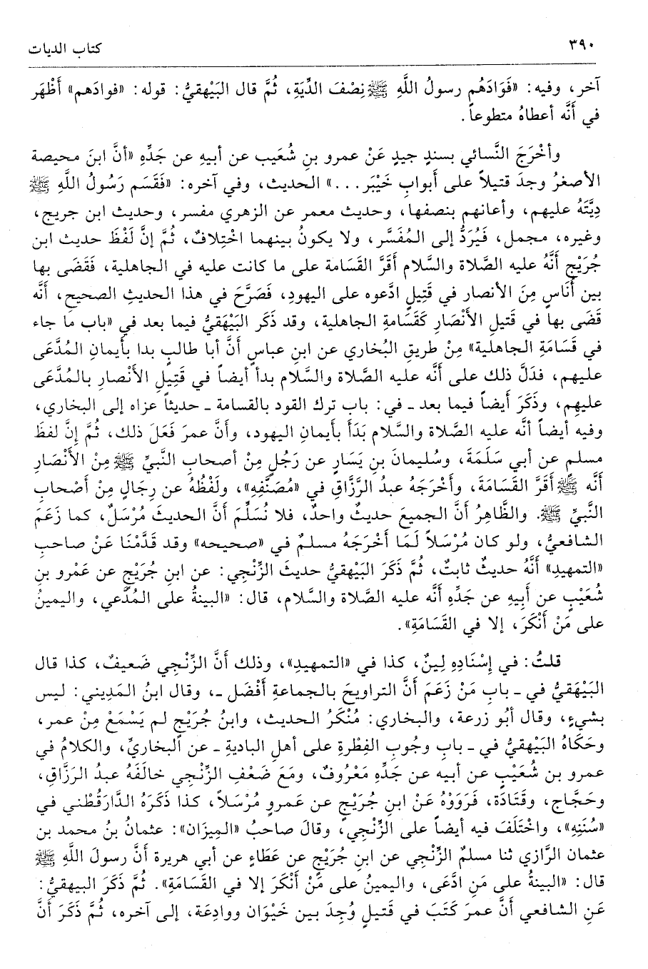 وأخْرَجَ النَّسائي بسندٍ جيدٍ عَنْ عمرو بنِ شُعَيب عن أبيهِ عن جَدِّهِ «أنَّ ابنَ محيصة الأصغرُ وجدَ قتيلًا على أَبوابِ خَيْبَر ... » الحديث، وفي آخره: «فَقَسَم رَسُولُ اللَّهِ صلى الله عليه وسلّم دِيَّتَهُ مجمِلٌ، فَيُرَدُ إلى المُفَسَّر، ولا يكونُ بينهما اخْتِلافٌ، ثُمَّ إنَّ لَفْظَ حديث ابن جُرَيْج أَنَّهُ عليه الصَّلاة والسَّلام أَقَرَّ القَسَامة على ما كانت عليه في الجاهلية، فَقَضَى بها بين أُنَاسٍ مِنَ الأنصاريِ في قَتِيلٍ ادَّعوه على اليهودِ، فَصَرَّحَ في هذا الحديثِ الصحيحِ، أَنَّه قَضَى بها في قَتيلِ الأَنْصَارِ كَقَسَامةِ الجاهلية، وقد ذَكَر البَيْهَقيُّ فيما بعد في «باب ما جاء في قَسَامَةِ الجاهلية» مِنْ طريقِ البُخاري عن ابنِ عباسٍ أَنَّ أبا طالبٍ بدا بأَيمانِ المُدَّعَى عليهم، فدَلَّ ذلك على أَنَّه عليه الصَّلاة والسَّلام بدأ أيضًا في قَتِيلِ الأَنْصارِ بالمُدَّعَى عليهِم، وذَكَرَ أَيضًا فيما بعد - في: باب ترك القود بالقسامة - حديثًا عزاه إلى البخاري، وفيه أيضًا أنَّه عليه الصَّلاة والسَّلام بَدَأَ بأَيمانِ اليهود، وأَنَّ عمرَ فَعَلَ ذلك، ثُمَّ إِنَّ لفظَ مسلمٍ عن أبي سَلَمَةَ، وسُليمانَ بنِ يَسَارٍ عن رَجُلٍ مِنْ أصحابِ النَّبيِّ صلى الله عليه وسلّم مِنْ الأَنْصَارِ أَنَّه صلى الله عليه وسلّم أَقَرَّ القَسَامَةَ، وأَخْرَجَهُ عبدُ الرَّزَّاقِ في «مُصَنَّفِهِ»، ولَفْظُهُ عن رِجَالٍ مِنْ أَصْحابِ النَّبيِّ صلى الله عليه وسلّم والظَّاهِرُ أَنَّ الجميعَ حديثٌ واحدً، فلا نُسَلِّمَ أَنَّ الحديثَ مُرْسَلٌ، كما زَعَمَ الشافعيُّ، ولو كان مُرْسَلًا لَمَا أَخْرَجَهُ مسلمٌ في «صحيحه» وقد قَدَّمْنَا عَنْ صاحبِ «التمهيدِ» أَنَّهُ حديثٌ ثابتٌ، ثُمَّ ذَكَرَ البَيْهقيُّ حديثَ الزِّنْجِي: عن ابنِ جُرَيْجٍ عن عَمْرو بنِ شُعَيْبٍ عن أَبِيهِ عن جَدِّهِ أَنَّه عليه الصَّلاة والسَّلام، قال: «البينةُ على المُدَّعي، واليمينُ على مَنْ أَنْكَرَ، إلا في القَسَامَةِ».