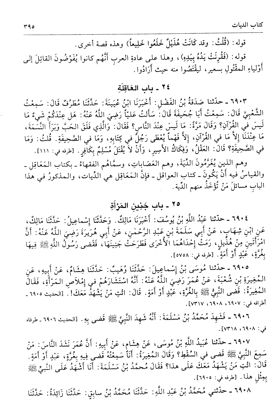 6903 - حَدَّثَنَا صَدَقَةُ بْنُ الْفَضْلِ أَخْبَرَنَا ابْنُ عُيَيْنَةَ حَدَّثَنَا مُطَرِّفٌ قَالَ سَمِعْتُ الشَّعْبِىَّ قَالَ سَمِعْتُ أَبَا جُحَيْفَةَ قَالَ سَأَلْتُ عَلِيًّا - رضى الله عنه - هَلْ عِنْدَكُمْ شَىْءٌ مَا لَيْسَ فِى الْقُرْآنِ وَقَالَ مَرَّةً مَا لَيْسَ عِنْدَ النَّاسِ فَقَالَ وَالَّذِى فَلَقَ الْحَبَّ وَبَرَأَ النَّسَمَةَ مَا عِنْدَنَا إِلاَّ مَا فِى الْقُرْآنِ، إِلاَّ فَهْمًا يُعْطَى رَجُلٌ فِى كِتَابِهِ، وَمَا فِى الصَّحِيفَةِ. قُلْتُ وَمَا فِى الصَّحِيفَةِ قَالَ الْعَقْلُ، وَفِكَاكُ الأَسِيرِ، وَأَنْ لاَ يُقْتَلَ مُسْلِمٌ بِكَافِرٍ. أطرافه 111، 1870، 3047، 3172، 3179، 6755، 6915، 7300 تحفة 10311 - 14/ 9
