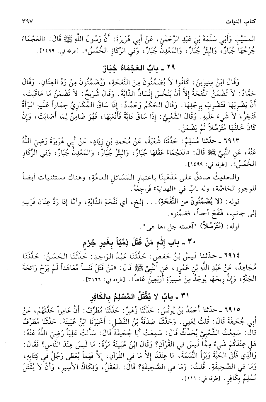 6913 - حَدَّثَنَا مُسْلِمٌ حَدَّثَنَا شُعْبَةُ عَنْ مُحَمَّدِ بْنِ زِيَادٍ عَنْ أَبِى هُرَيْرَةَ - رضى الله عنه - عَنِ النَّبِىِّ - صلى الله عليه وسلم - قَالَ «الْعَجْمَاءُ عَقْلُهَا جُبَارٌ، وَالْبِئْرُ جُبَارٌ، وَالْمَعْدِنُ جُبَارٌ، وَفِى الرِّكَازِ الْخُمُسُ». أطرافه 1499، 2355، 6912 - تحفة 14387 - 16/ 9