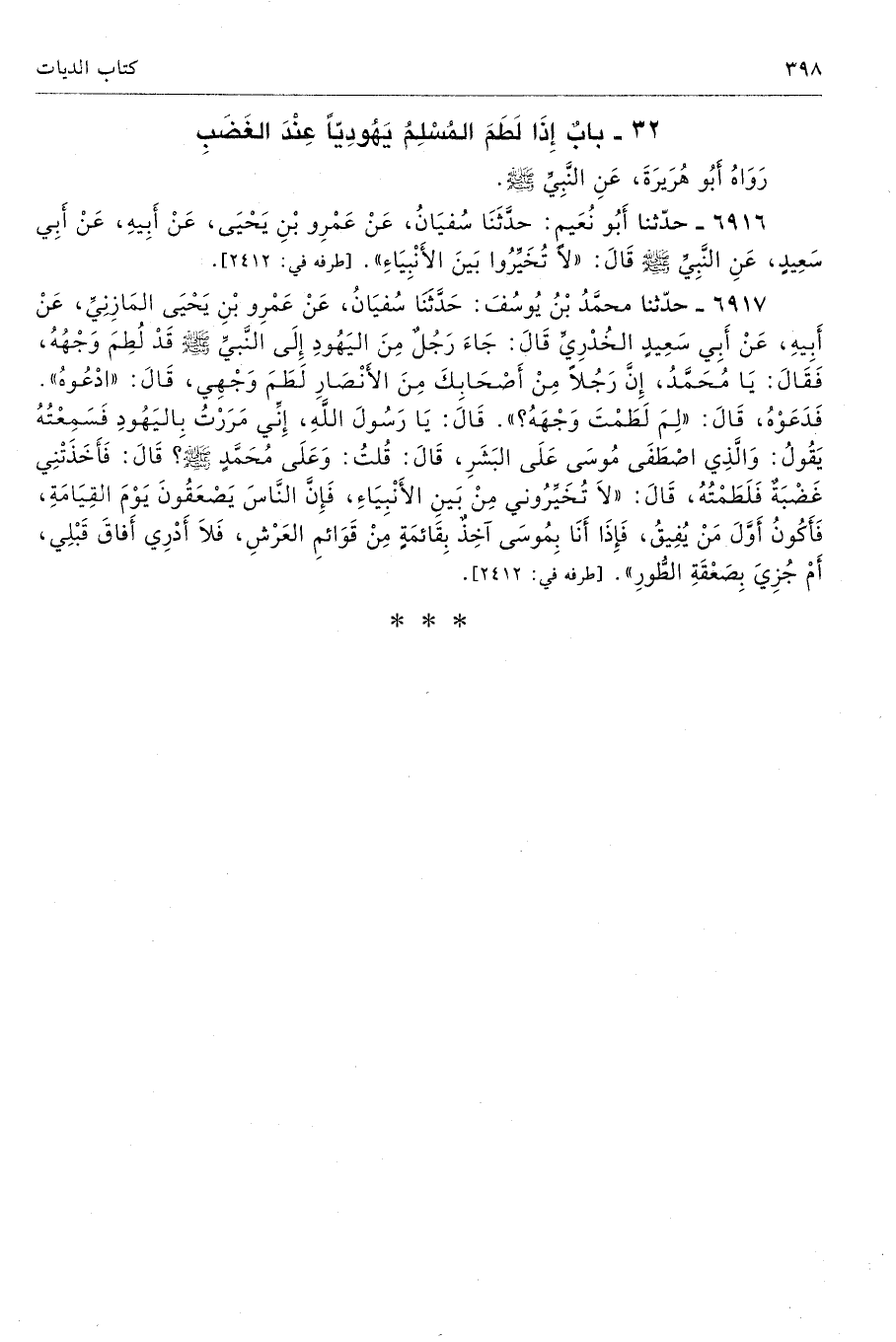 6916 - حَدَّثَنَا أَبُو نُعَيْمٍ حَدَّثَنَا سُفْيَانُ عَنْ عَمْرِو بْنِ يَحْيَى عَنْ أَبِيهِ عَنْ أَبِى سَعِيدٍ عَنِ النَّبِىِّ - صلى الله عليه وسلم - قَالَ «لاَ تُخَيِّرُوا بَيْنَ الأَنْبِيَاءِ». أطرافه 2412، 3398، 4638، 6917، 7427 - تحفة 4405