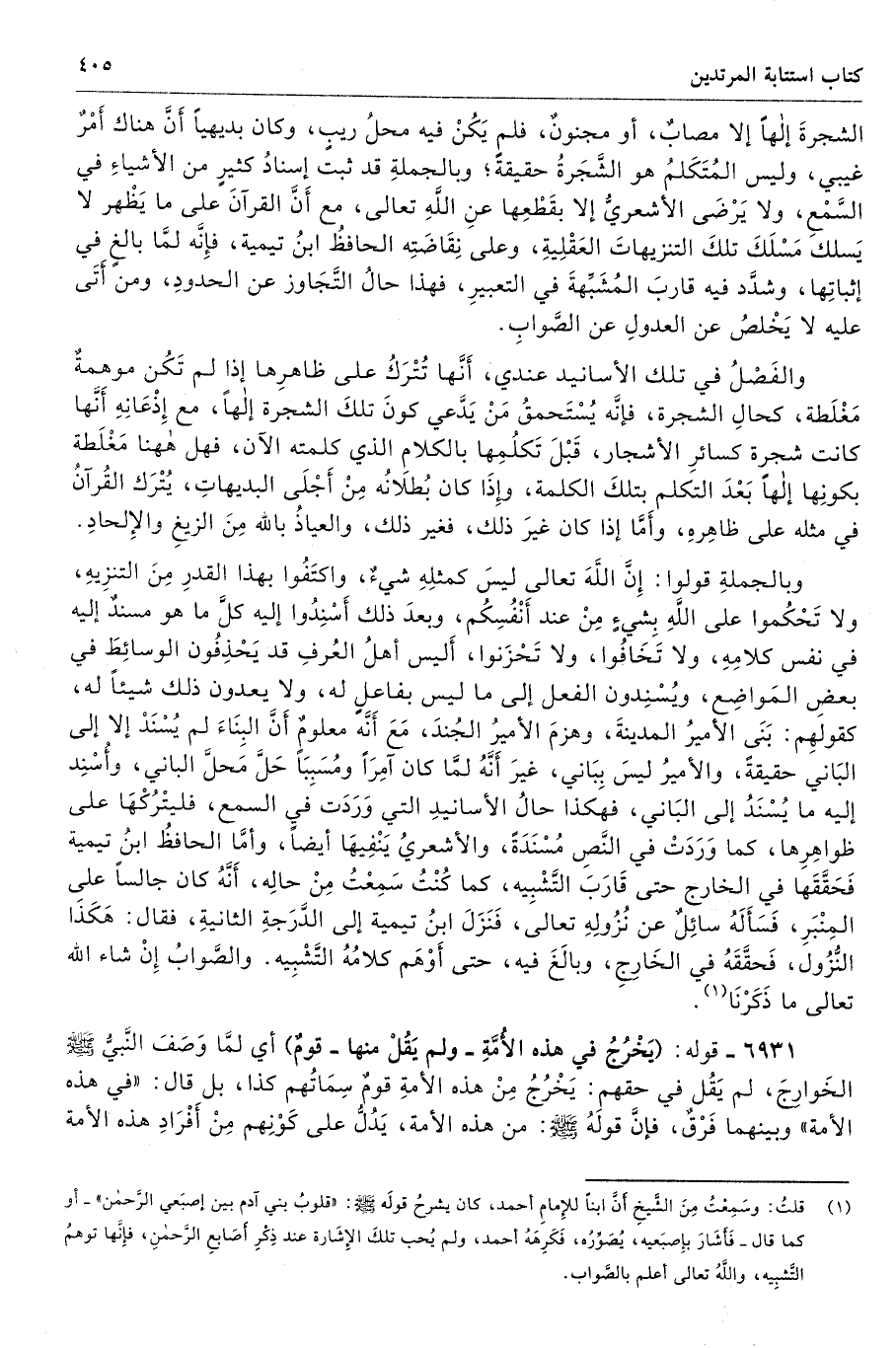 والفَصْلُ في تلك الأسانيد عندي، أَنَّها تُتْرَكُ على ظاهرِها إذا لم تَكُن موهمةٌ مَغْلَطة، كحالِ الشجرة، فإنَّه يُسْتَحَقُ مِنْ يَدَّعي كونَ تلكَ الشجرة إلهًا، مع إِذْعَانِهِ أَنَّها كانت شجرة كسائرِا لأشجار، قَبْلَ تَكلُمِها بالكلامِ الذي كلمته الآن، فهل ههنا مَغْلَطة بكونِا إلهًا بَعْدَ التكلم بتلكَ الكلمة، وإِذَا كان بُطلانُه مِنْ أَجْلَى البديهاتِ، يُتْرَك القُرآنُ في مثله على ظاهِرهِ، وأَمَّا إذا كان غيرَ ذلك، فغير ذلك، والعياذُ بالله مِنَ الزيغِ والإِلحادِ.