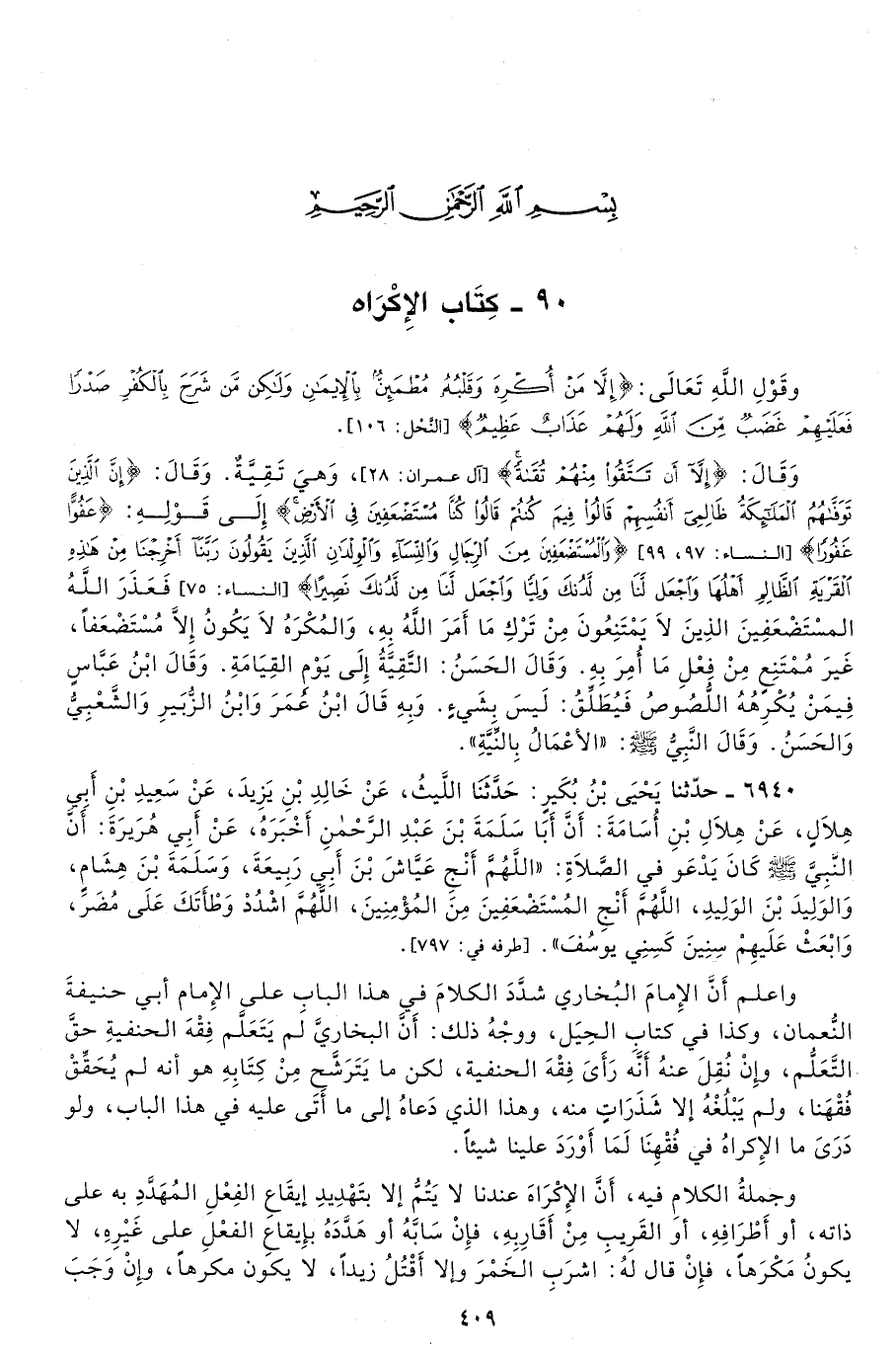 وَقَالَ: {إِلَّا أَنْ تَتَّقُوا مِنْهُمْ تُقَاةً} [آل عمران: 28]، وَهيَ تَقِيَّةٌ. وَقَالَ: {إِنَّ الَّذِينَ تَوَفَّاهُمُ الْمَلَائِكَةُ ظَالِمِي أَنْفُسِهِمْ قَالُوا فِيمَ كُنْتُمْ قَالُوا كُنَّا مُسْتَضْعَفِينَ فِي الْأَرْضِ} إِلَى قَوْلِهِ: {عَفُوًّا غَفُورًا} [النساء: 97 - 99] {وَالْمُسْتَضْعَفِينَ مِنَ الرِّجَالِ وَالنِّسَاءِ وَالْوِلْدَانِ الَّذِينَ يَقُولُونَ رَبَّنَا أَخْرِجْنَا مِنْ هَذِهِ الْقَرْيَةِ الظَّالِمِ أَهْلُهَا وَاجْعَلْ لَنَا مِنْ لَدُنْكَ وَلِيًّا وَاجْعَلْ لَنَا مِنْ لَدُنْكَ نَصِيرًا} [النساء: 75] فَعَذَرَ اللهُ المسْتَضْعَفِينَ الذِينَ لاَ يَمْتَنِعُونَ مِنْ تَرْكِ مَا أَمَرَ اللهُ بِهِ، وَالمُكْرَهُ لاَ يَكُونُ إِلَّا مُسْتَضْعَفًا، غَيرَ مُمْتَنِعٍ مِنْ فِعْلِ مَا أُمِرَ بِهِ. وَقَالَ الحَسَنُ: التَّقِيَّةُ إِلَى يَوْمِ القِيَامَةِ. وَقَالَ ابْنُ عَبَّاسٍ فِيمَنْ يُكْرِهُهُ اللُّصُوصُ فَيُطَلِّقُ: لَيسَ بِشَيءٍ. وَبِهِ قَالَ ابْنُ عُمَرَ وَابْنُ الزُّبَيرِ وَالشَّعْبِيُّ وَالحَسَنُ. وَقَالَ النَّبِيُّ صلى الله عليه وسلّم «الأعْمَالُ بِالنِّيَّةِ».