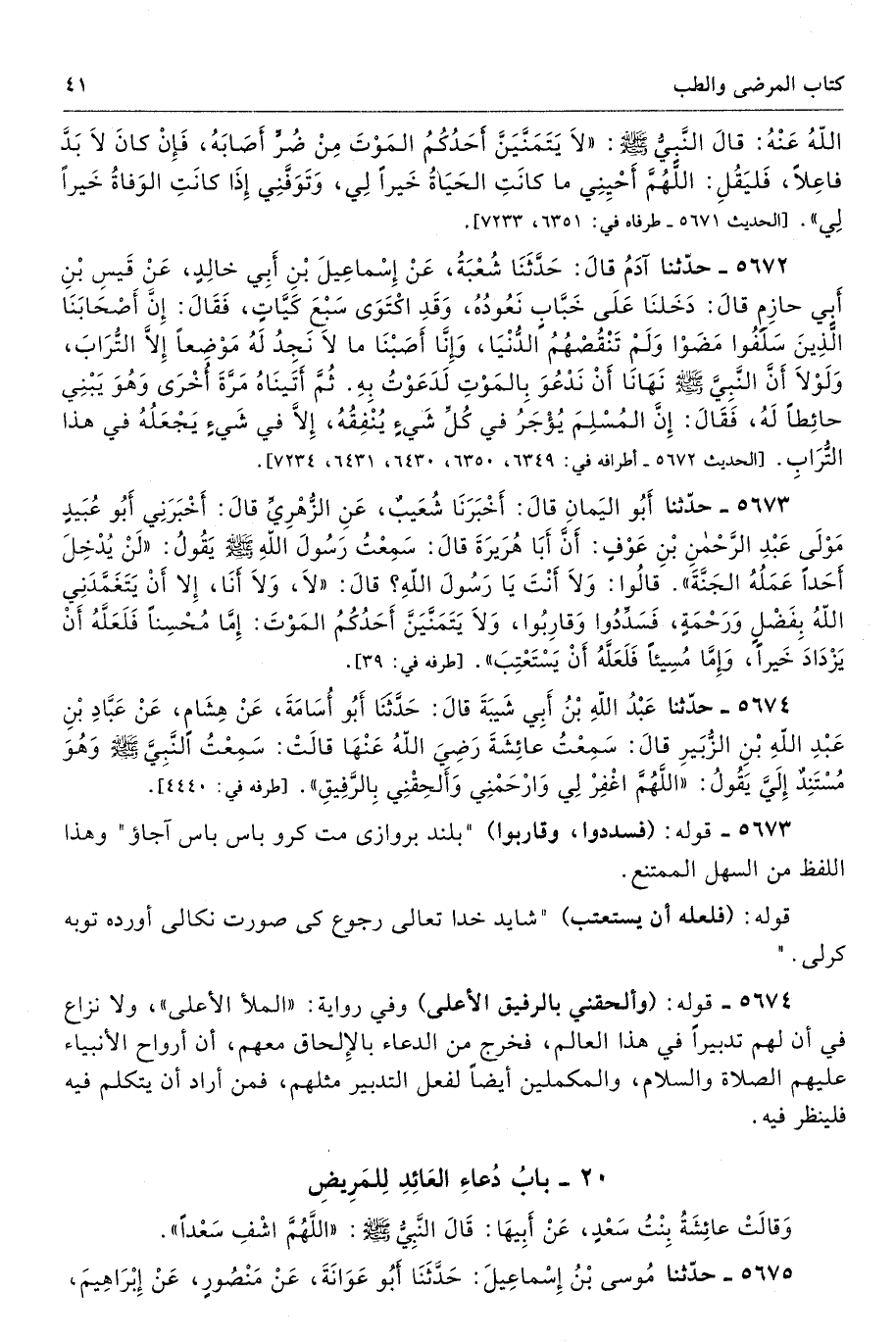 الله عنه - قَالَ النَّبِىُّ - صلى الله عليه وسلم - «لاَ يَتَمَنَّيَنَّ أَحَدُكُمُ الْمَوْتَ مِنْ ضُرٍّ أَصَابَهُ، فَإِنْ كَانَ لاَ بُدَّ فَاعِلاً فَلْيَقُلِ اللَّهُمَّ أَحْيِنِى مَا كَانَتِ الْحَيَاةُ خَيْرًا لِى، وَتَوَفَّنِى إِذَا كَانَتِ الْوَفَاةُ خَيْرًا لِى». طرفاه 6351، 7233 - تحفة 441